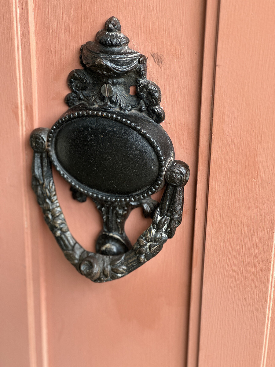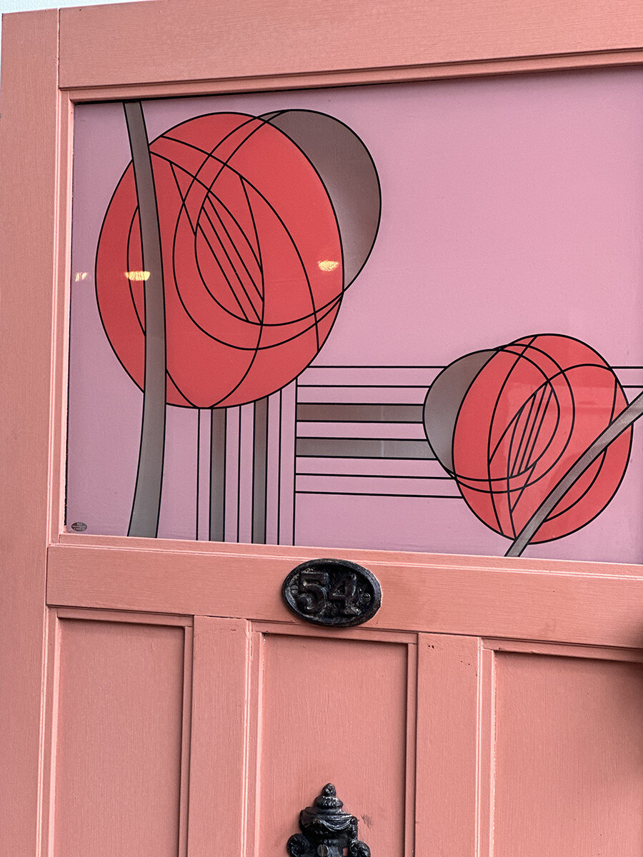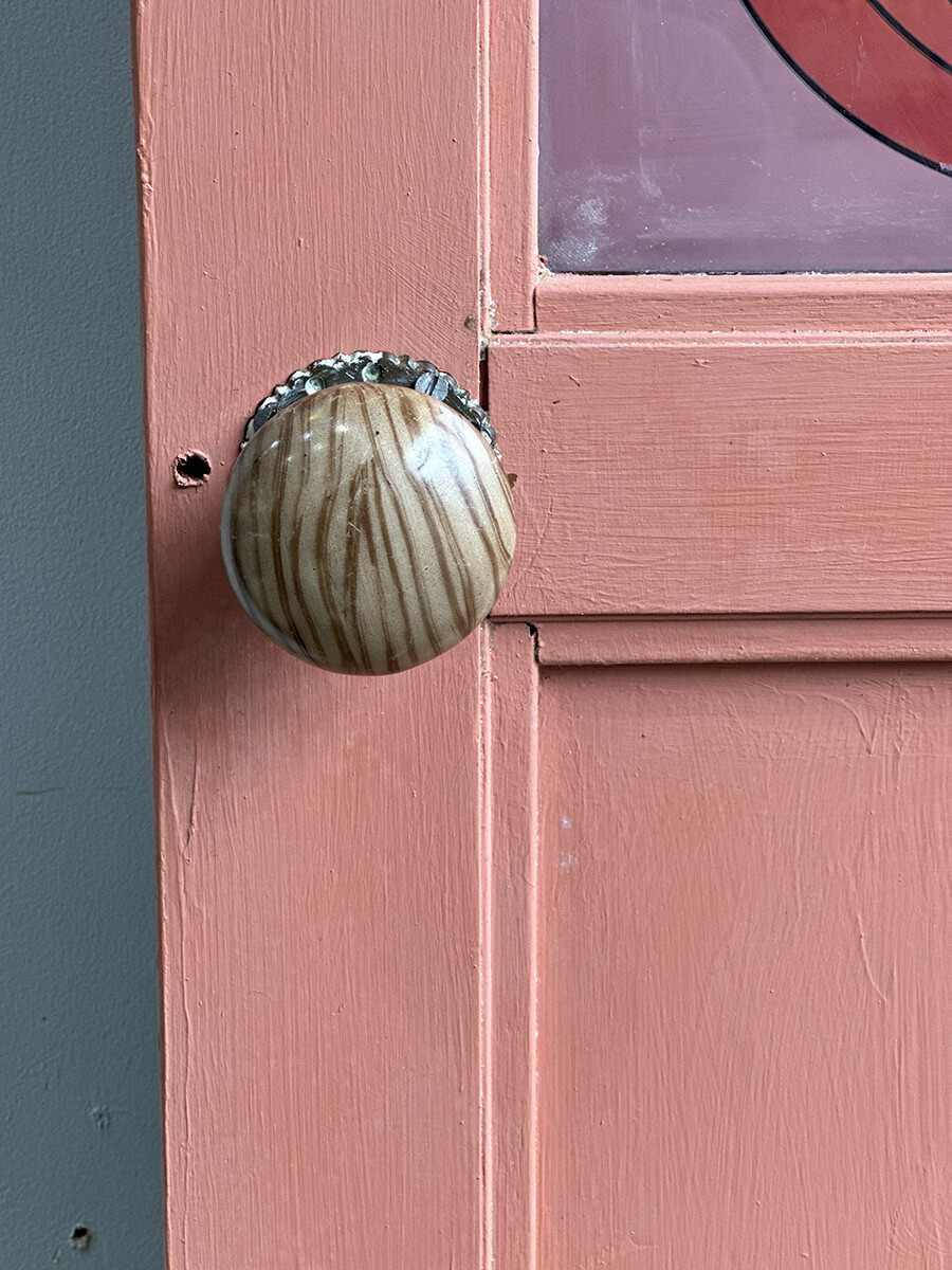 1920~1930년대 아트 데코(Art Deco ; 프랑스식 발음은 아르 데코) 시대에 제작된 오리지널 프론트 도어(현관문)입니다. 도어에 들어가 있는 글라스 장식에서 사물을 추상적인 도형과 직선으로 표현하는 당시의 양식적 특징을 볼 수 있죠. 두꺼운 원목으로 제작되어 있어 매우 묵직하며, 코랄 핑크 컬러의 바디에 스테인드 글라스까지 모두 같은 계통의 컬러를 가지고 있어서 캐릭터가 매우 유니크합니다. 또한 여기에 넘버 플레이트와 도어 노커 같은 하드웨어는 블랙 컬러로 달려 있어서 컬러의 대비효과가 강해서 더욱 캐릭터가 살아나는 느낌입니다.