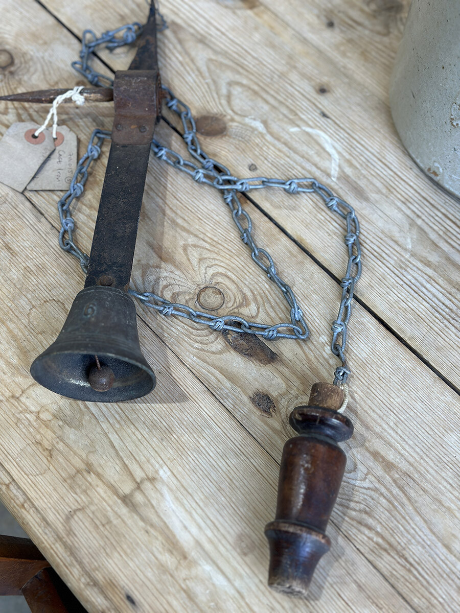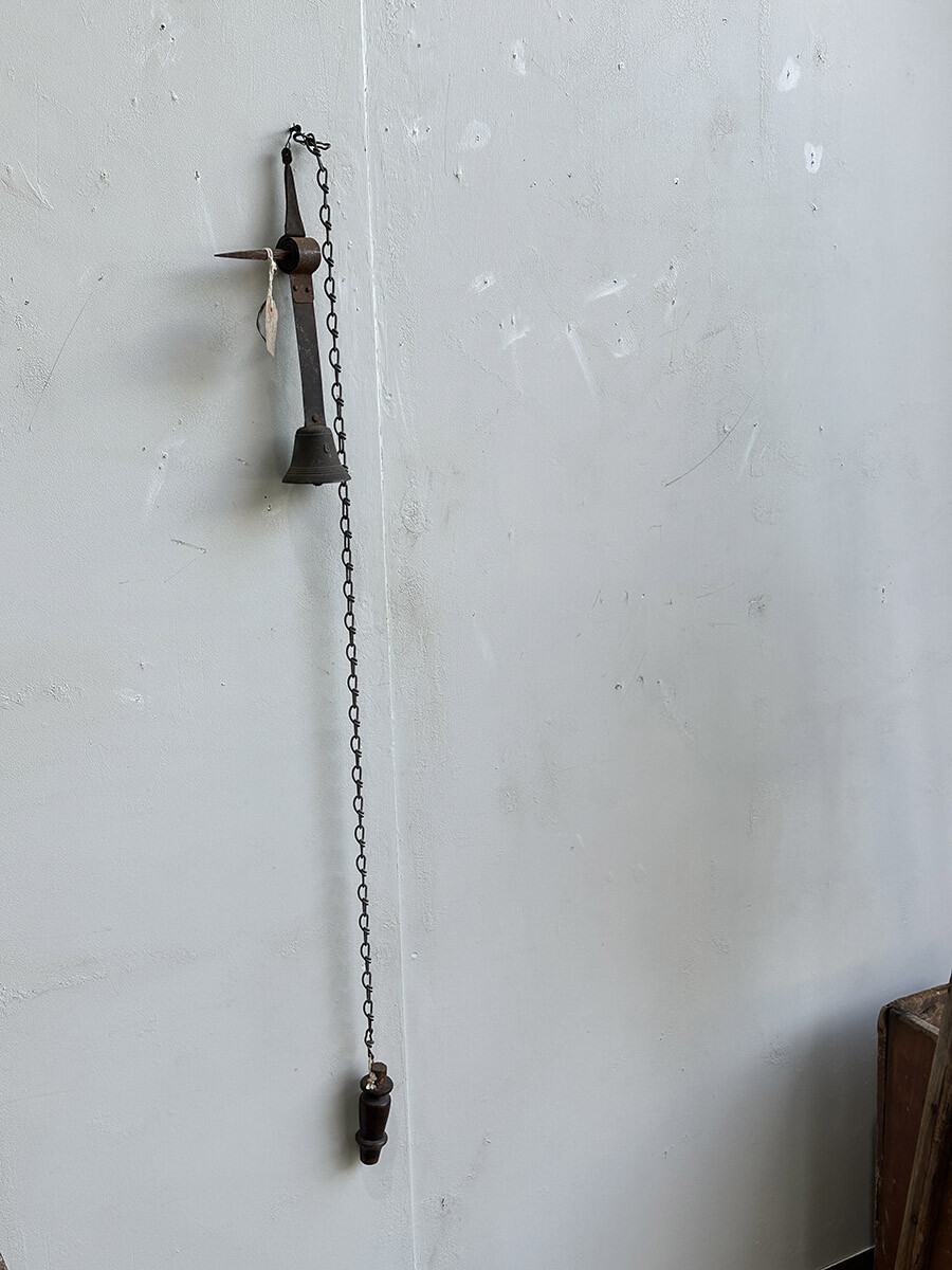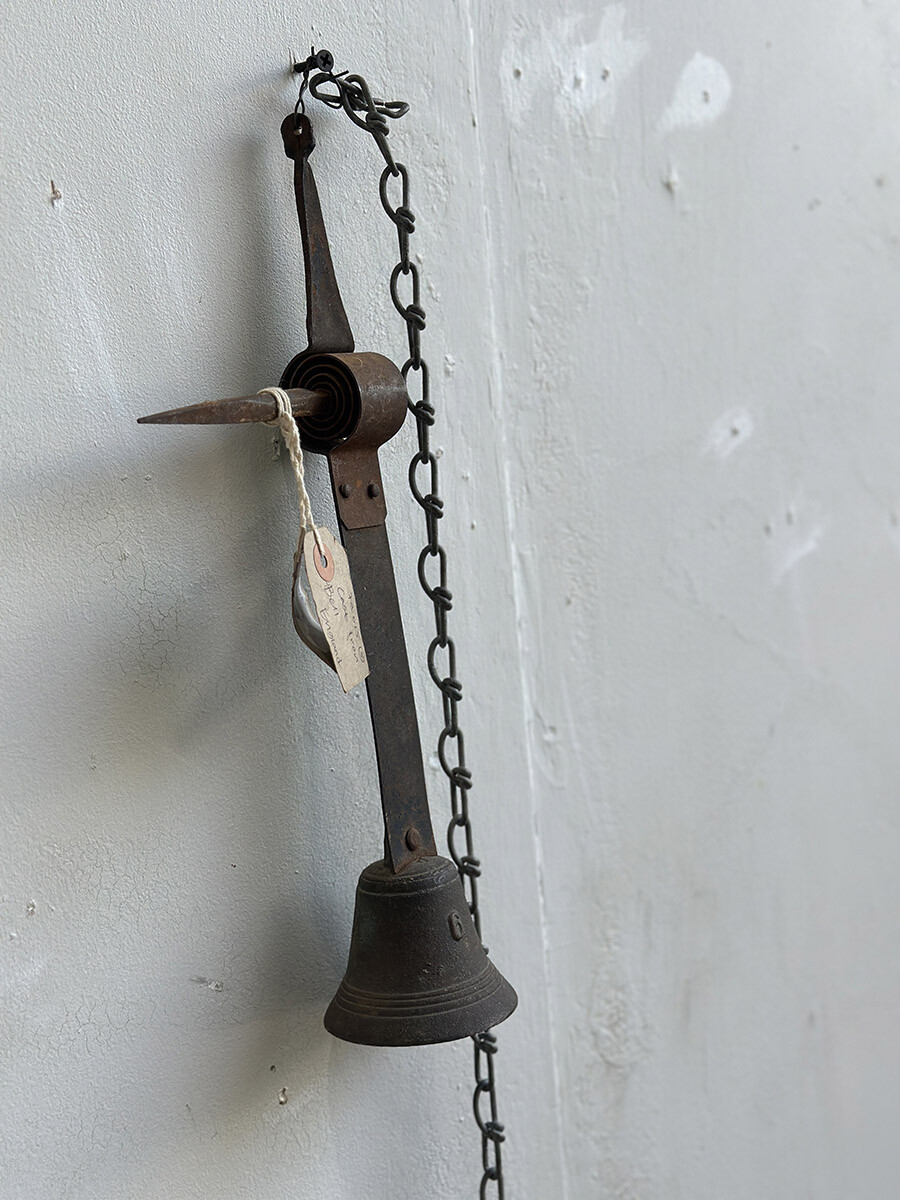 카스트 아이언(주물) 소재로 제작된 앤틱 벨입니다. 종의 생김새가 특이하다고 여기실 것 같은데요, 지금의 초인종처럼 사용하던 종입니다. 작은 말뚝처럼 생긴 쐐기 부분을 회전축으로 해서, 길게 체인으로 연결된 손잡이를 잡고 당기면 딸랑 딸랑 소리를 내도록 만들었죠.