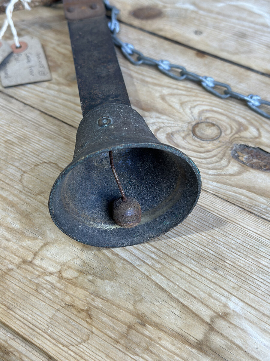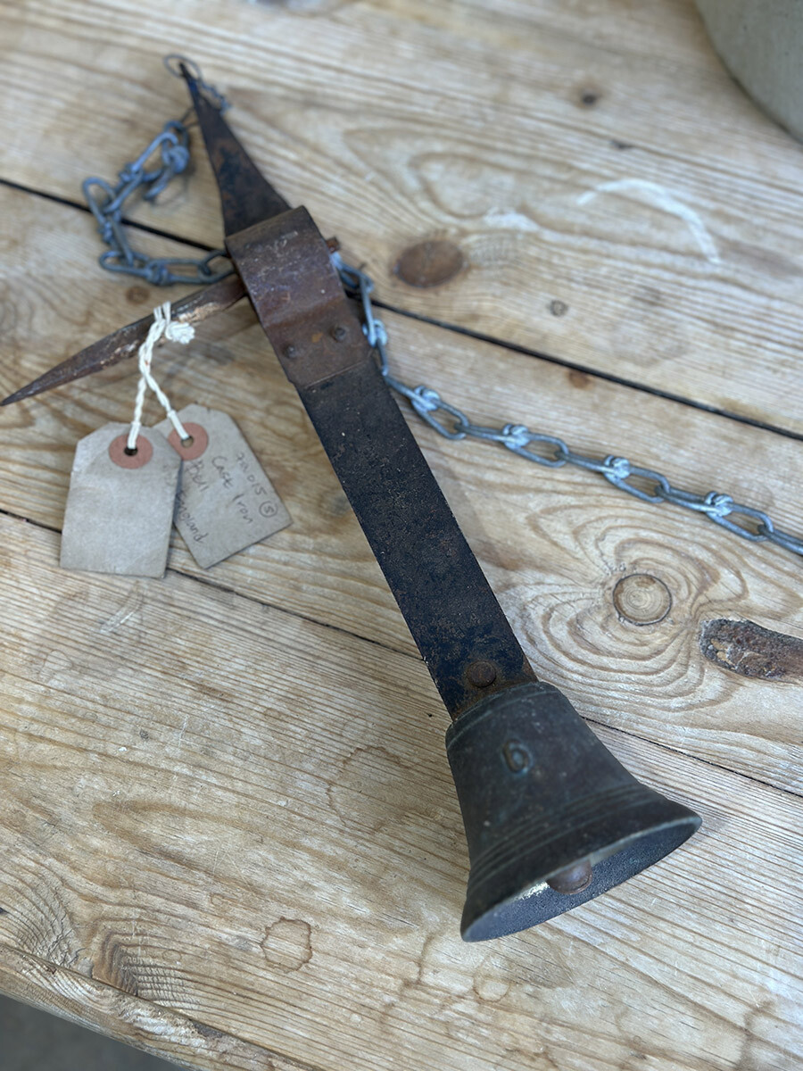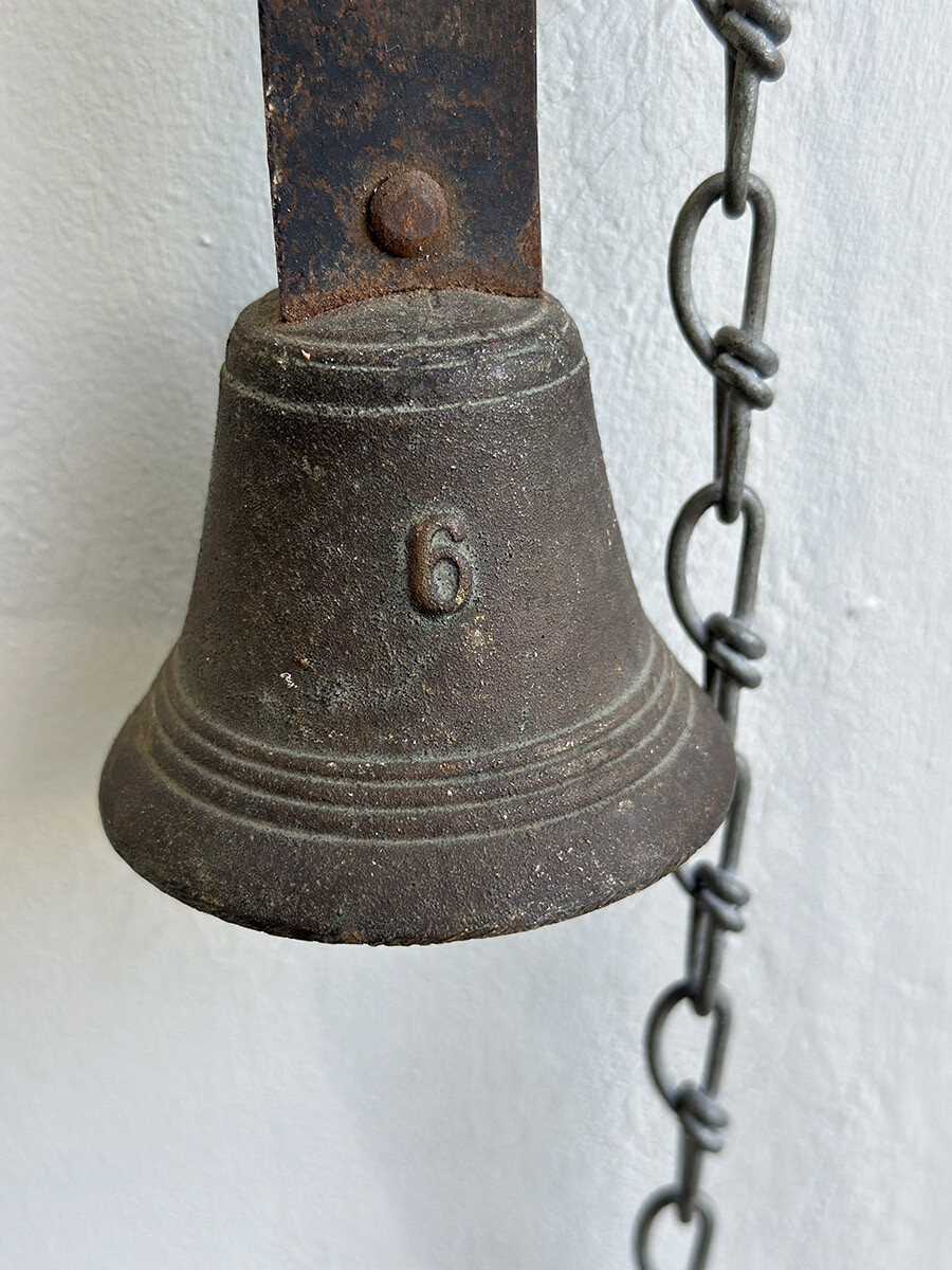 카스트 아이언(주물) 소재로 제작된 앤틱 벨입니다. 종의 생김새가 특이하다고 여기실 것 같은데요, 지금의 초인종처럼 사용하던 종입니다. 작은 말뚝처럼 생긴 쐐기 부분을 회전축으로 해서, 길게 체인으로 연결된 손잡이를 잡고 당기면 딸랑 딸랑 소리를 내도록 만들었죠.