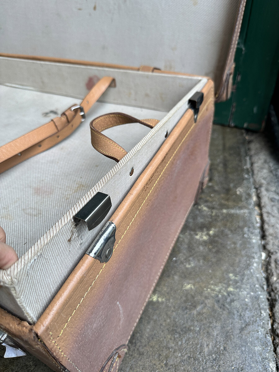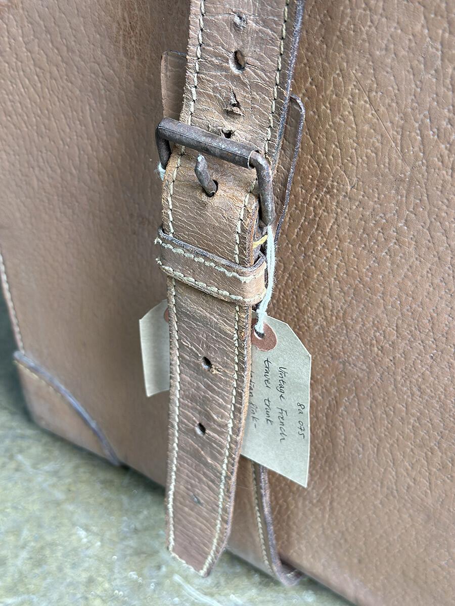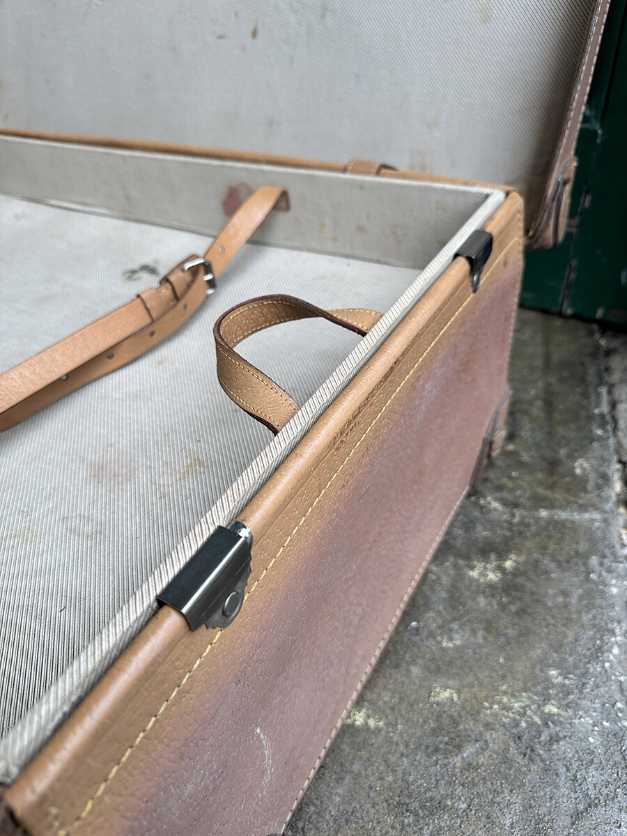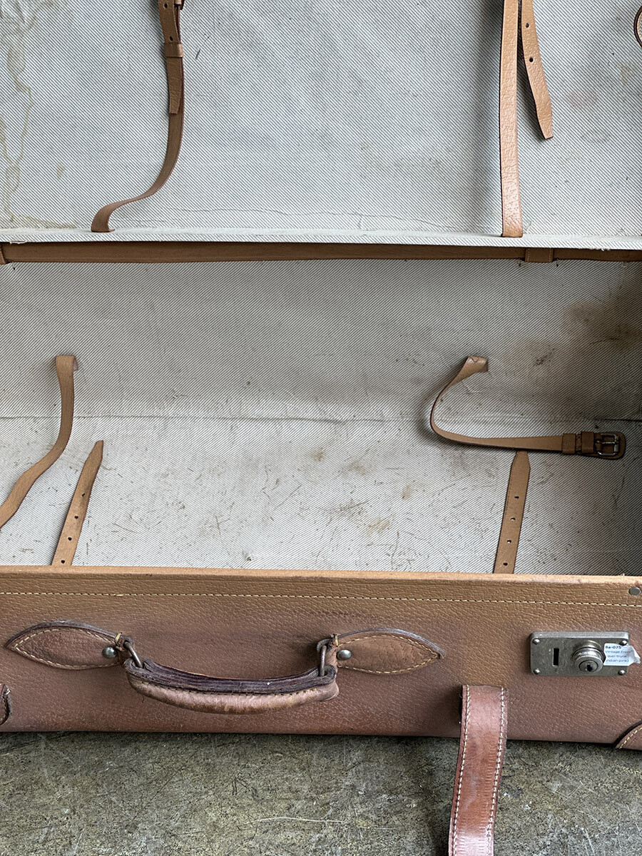 프랑스에서 제작된 여행용 트렁크입니다. 소재는 천연가죽으로 제작 되었으며, 내부는 2단으로 나뉘어 물건들을 크기나 용도에 맞춰 나누어 수납할 수 있게끔 제작되어 있습니다. 다양한 디스플레이 연출에 활용하기 좋은 빈티지 아이템이며, 물론 실사용 용도로도 사용 가능합니다. 다만 트렁크 열쇠는 보전되어 있지 않은 상태입니다. 트렁크 열쇠구멍이 있는 버튼부를 각각 바깥쪽으로 밀면 열리게 되어 있습니다. 가죽끈은 경화된 부분이 없이 상태가 매우 좋은 편입니다.