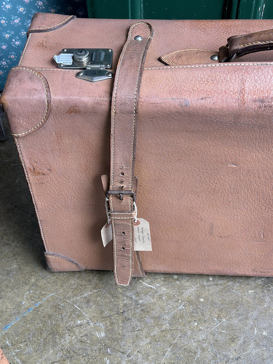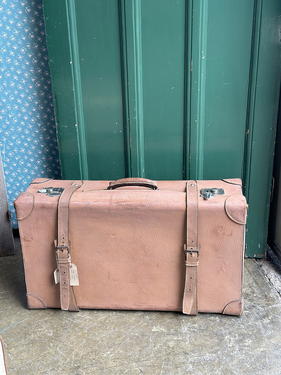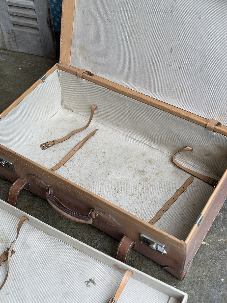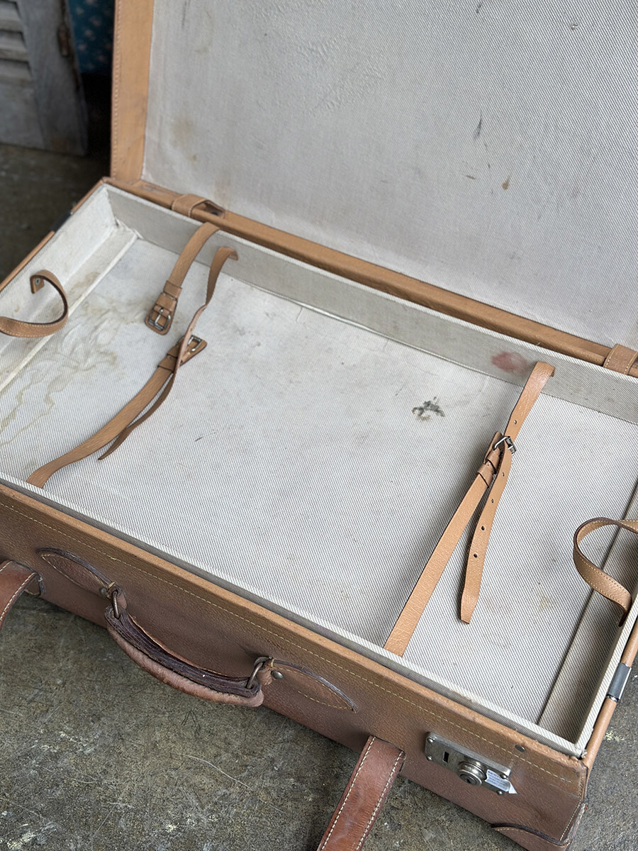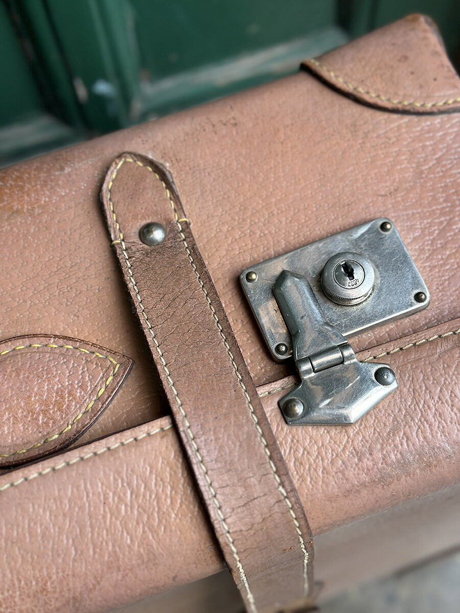 프랑스에서 제작된 여행용 트렁크입니다. 소재는 천연가죽으로 제작 되었으며, 내부는 2단으로 나뉘어 물건들을 크기나 용도에 맞춰 나누어 수납할 수 있게끔 제작되어 있습니다. 다양한 디스플레이 연출에 활용하기 좋은 빈티지 아이템이며, 물론 실사용 용도로도 사용 가능합니다. 다만 트렁크 열쇠는 보전되어 있지 않은 상태입니다. 트렁크 열쇠구멍이 있는 버튼부를 각각 바깥쪽으로 밀면 열리게 되어 있습니다. 가죽끈은 경화된 부분이 없이 상태가 매우 좋은 편입니다.