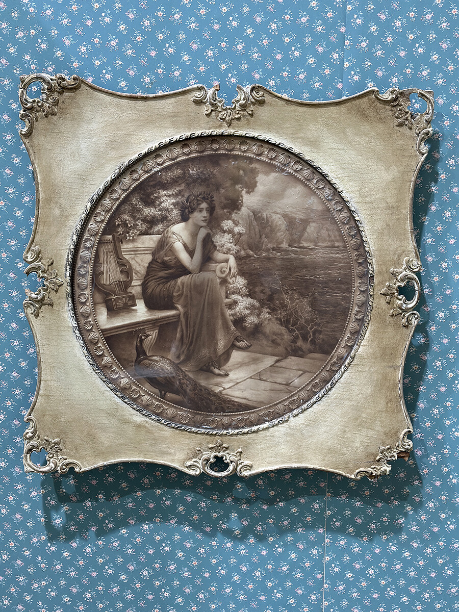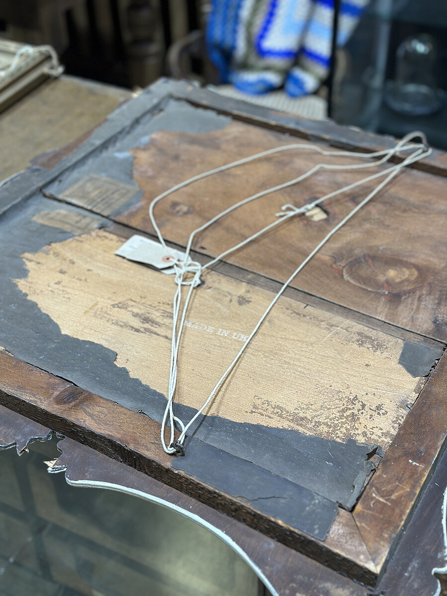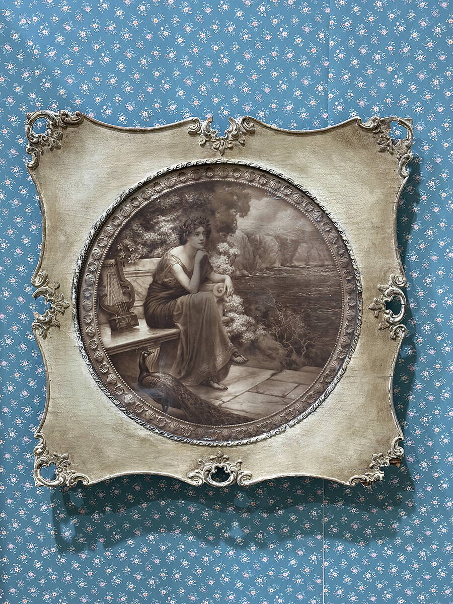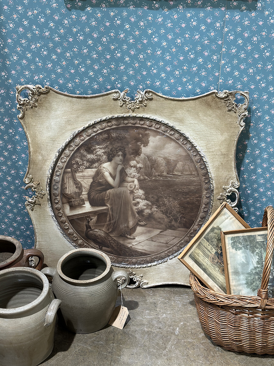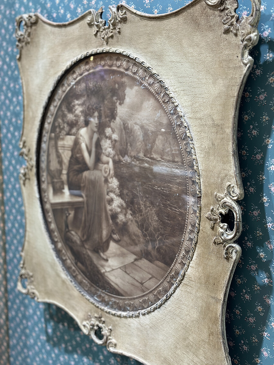 쉐비 시크 앤틱 프레임입니다. 정사각 프레임 안에 다시 정원형 프레임이 있는 프레임 속의 프레임 구조를 갖고 있는 이 앤틱 프레임은 플라스터(석고)와 유리로 제작되어 있습니다. 플라스터로 만들어진 앤틱 / 빈티지 프레임은 소재의 특성 상, 세월이 흐르면서 크랙이나 칩 등이 발생할 수밖에 없는데, 오히려 이러한 흔적들은 세월감의 요소로 받아들여지고 있습니다. 본 상품 내부의 그림은 프린트로 보이며, 전체적으로 뮤트(mute)된 컬러감을 갖고 있어 고요하고 차분한 느낌을 받습니다. 표구 변경하여 프레임만 사용하셔도 무방합니다.
