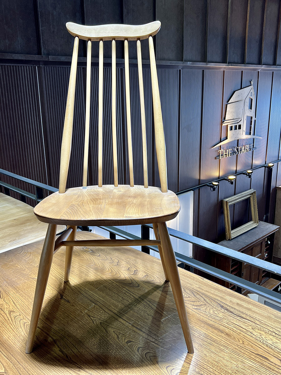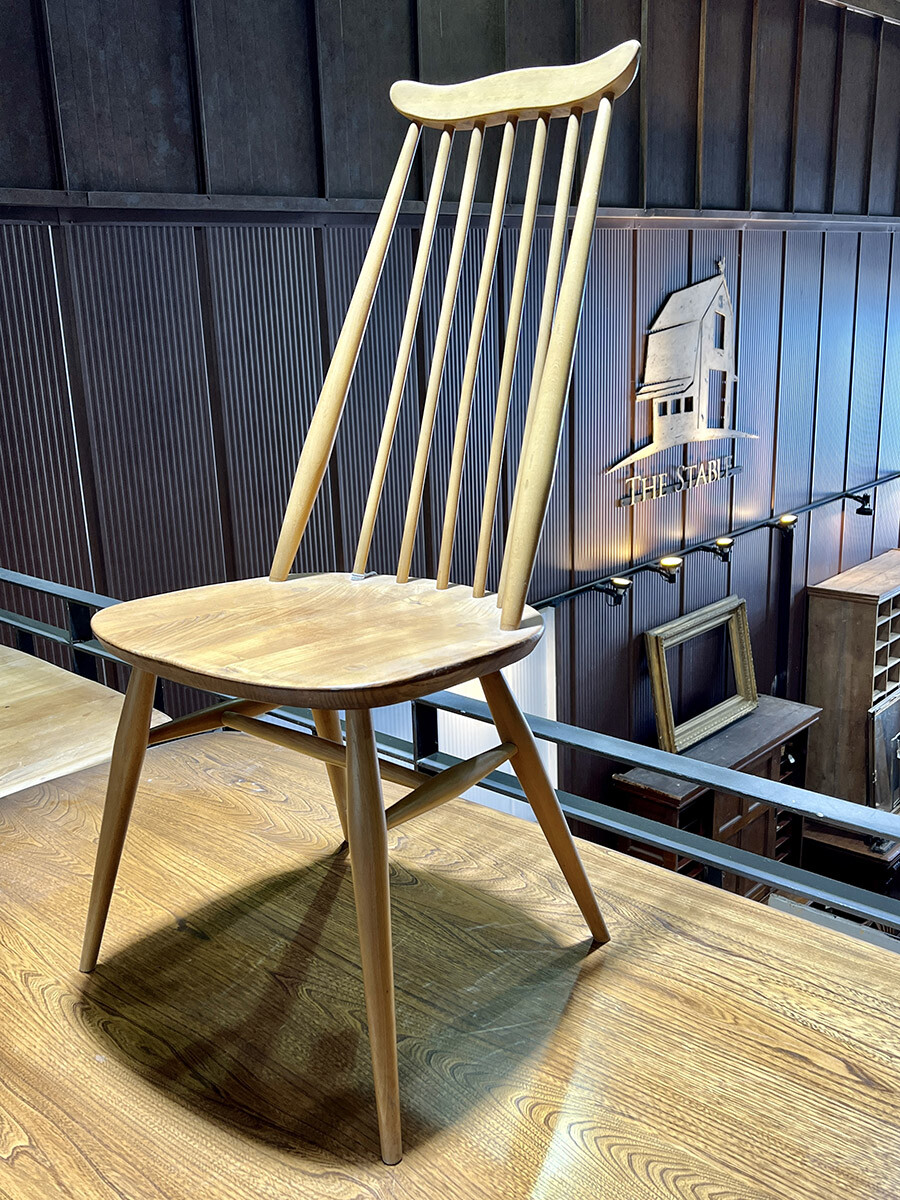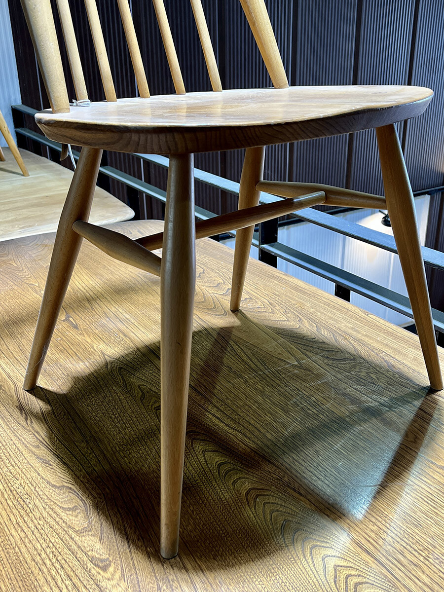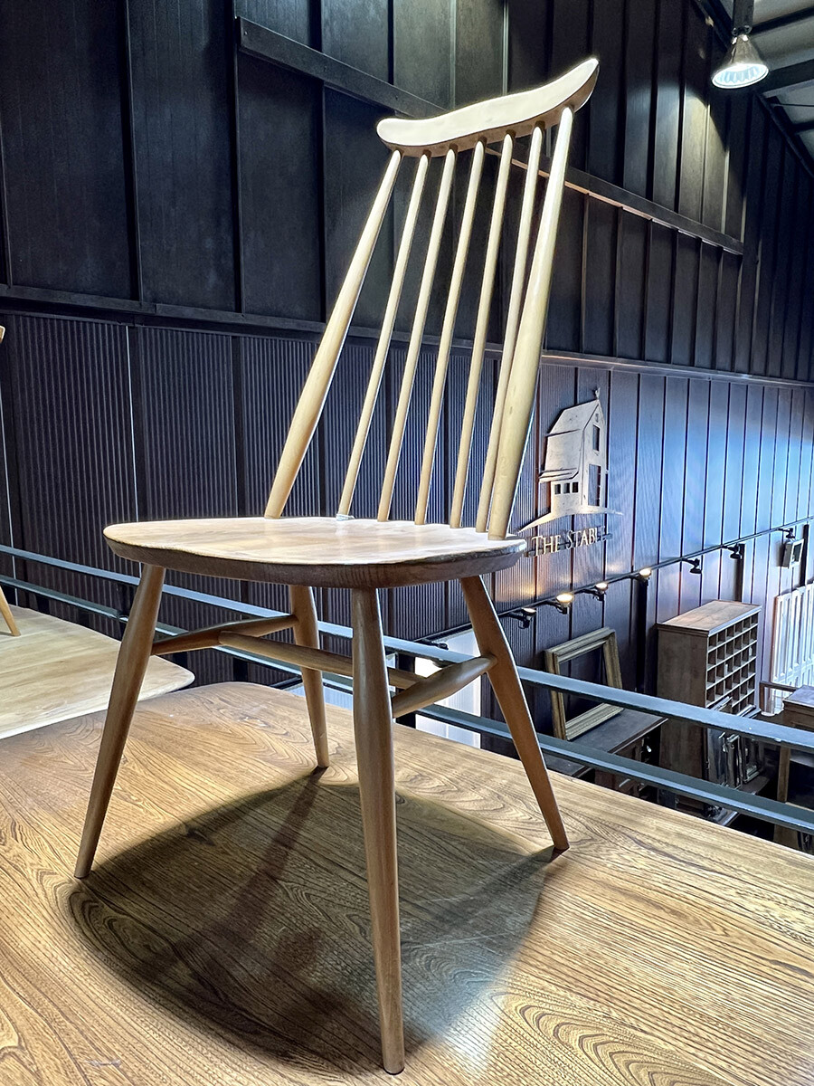 영국 가구 업계의 아이콘, 얼콜(ercol). 창업자의 오리지널 디자인을 하나의 제품군으로 모아 놓은 윈저 레인지(Windsor range)에 속하는 다이닝 체어 중 하나입니다. 얼콜 팬들에게 큰 인기를 누리고 있음에도 불구하고 1986년에 단종된 이후, 더 이상 복각되지 않고 있습니다. 때문에 현재까지도 제작되고 있는 퀘이커 체어나 기타 다른 체어에 비해 가격대가 높게 형성되어 있으며, 현재도 지속적인 가격 상승을 보이고 있는 아이템입니다. 하이백 윈저 체어 고유의 소박함과 단아함을 느낄 수 있으며, 스테이가드의 물결 모양이 넘치지 않는 장식미를 더하고 있습니다. 등받이 부분이 하이백으로 되어 있으며 전통적인 윈저 체어의 장점인 편안함이 얼콜에 의해 극대화 되어 있습니다. 시트 부분의 소재는 엘름(elm), 나머지 파츠들은 애쉬(ash), 비치(beech)입니다.