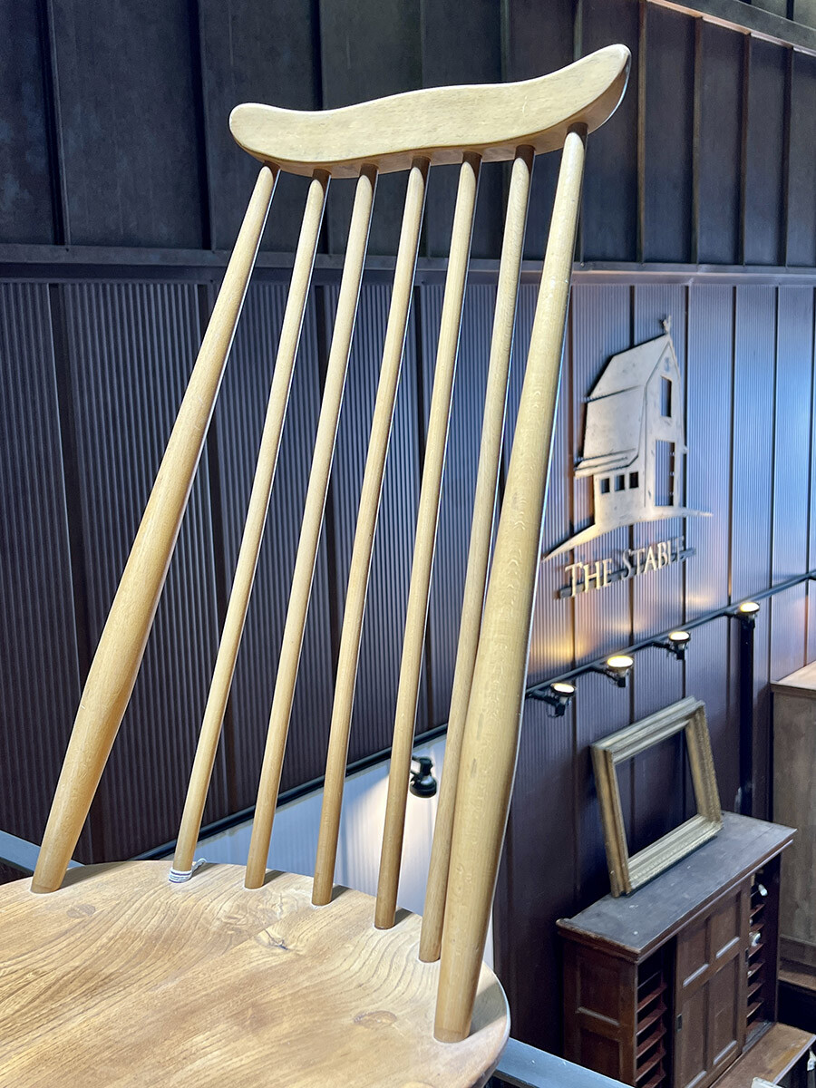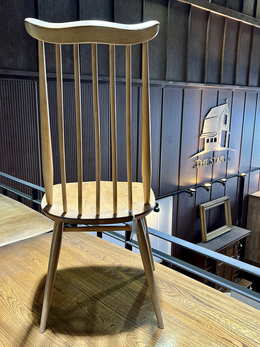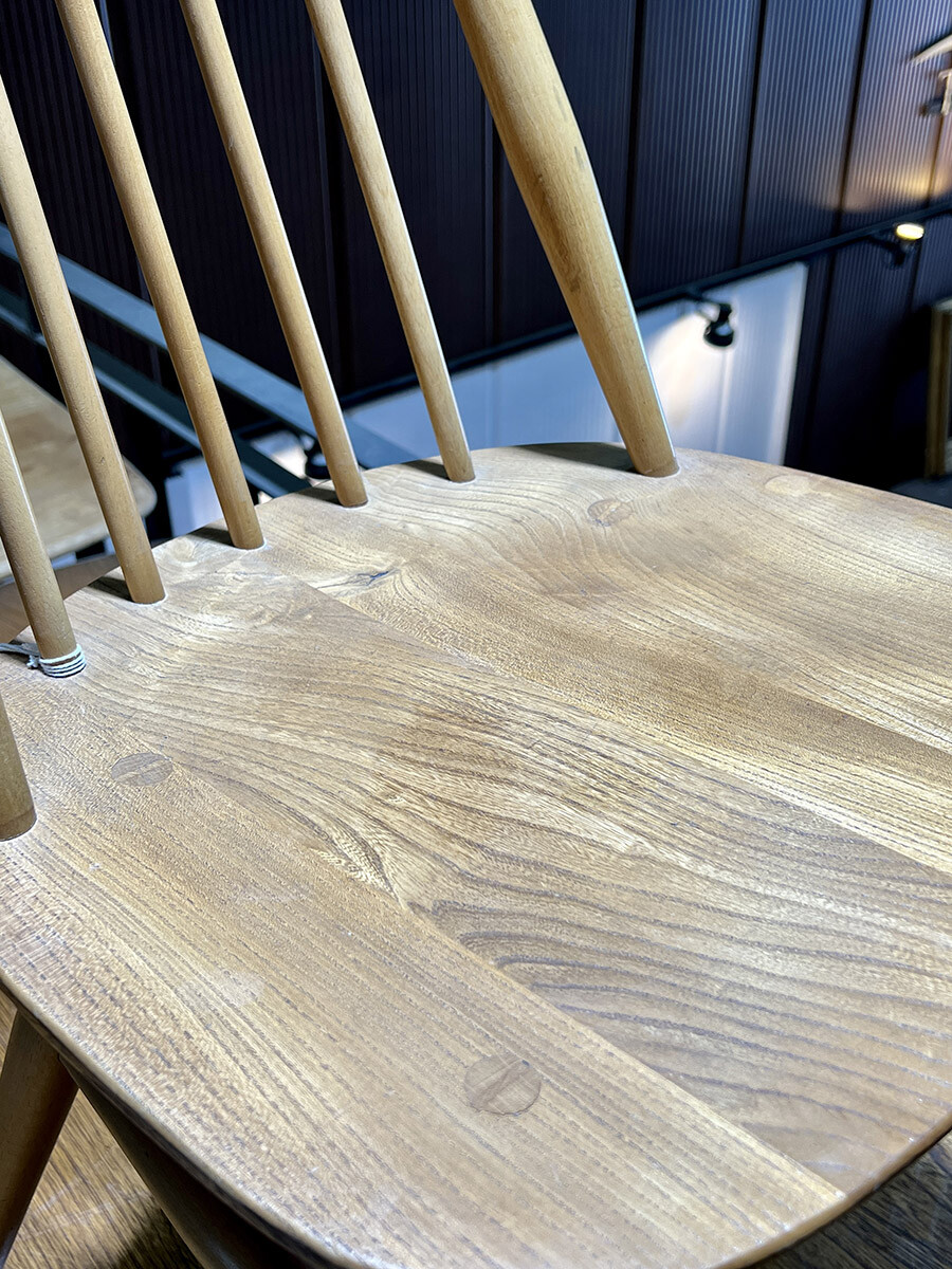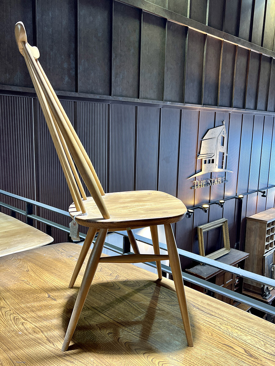 영국 가구 업계의 아이콘, 얼콜(ercol). 창업자의 오리지널 디자인을 하나의 제품군으로 모아 놓은 윈저 레인지(Windsor range)에 속하는 다이닝 체어 중 하나입니다. 얼콜 팬들에게 큰 인기를 누리고 있음에도 불구하고 1986년에 단종된 이후, 더 이상 복각되지 않고 있습니다. 때문에 현재까지도 제작되고 있는 퀘이커 체어나 기타 다른 체어에 비해 가격대가 높게 형성되어 있으며, 현재도 지속적인 가격 상승을 보이고 있는 아이템입니다. 하이백 윈저 체어 고유의 소박함과 단아함을 느낄 수 있으며, 스테이가드의 물결 모양이 넘치지 않는 장식미를 더하고 있습니다. 등받이 부분이 하이백으로 되어 있으며 전통적인 윈저 체어의 장점인 편안함이 얼콜에 의해 극대화 되어 있습니다. 시트 부분의 소재는 엘름(elm), 나머지 파츠들은 애쉬(ash), 비치(beech)입니다.