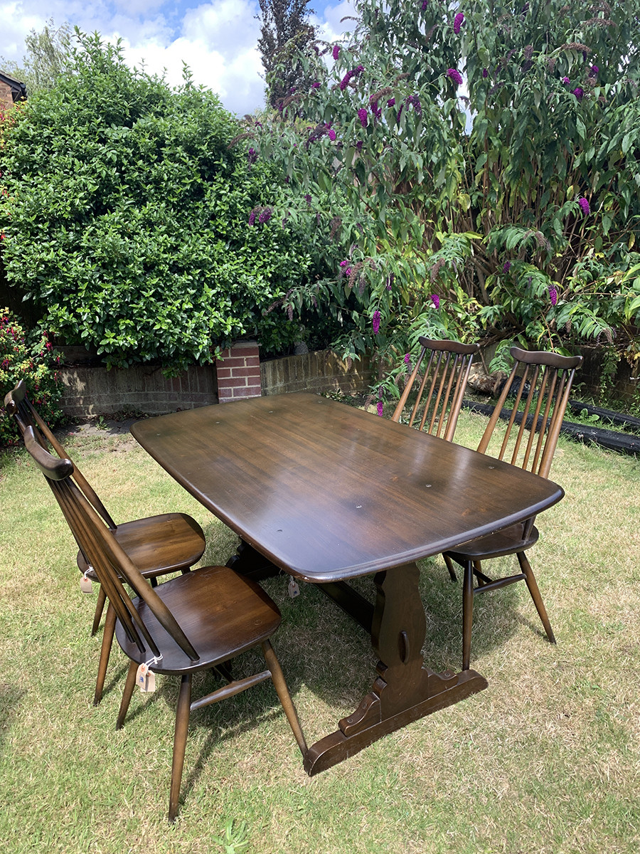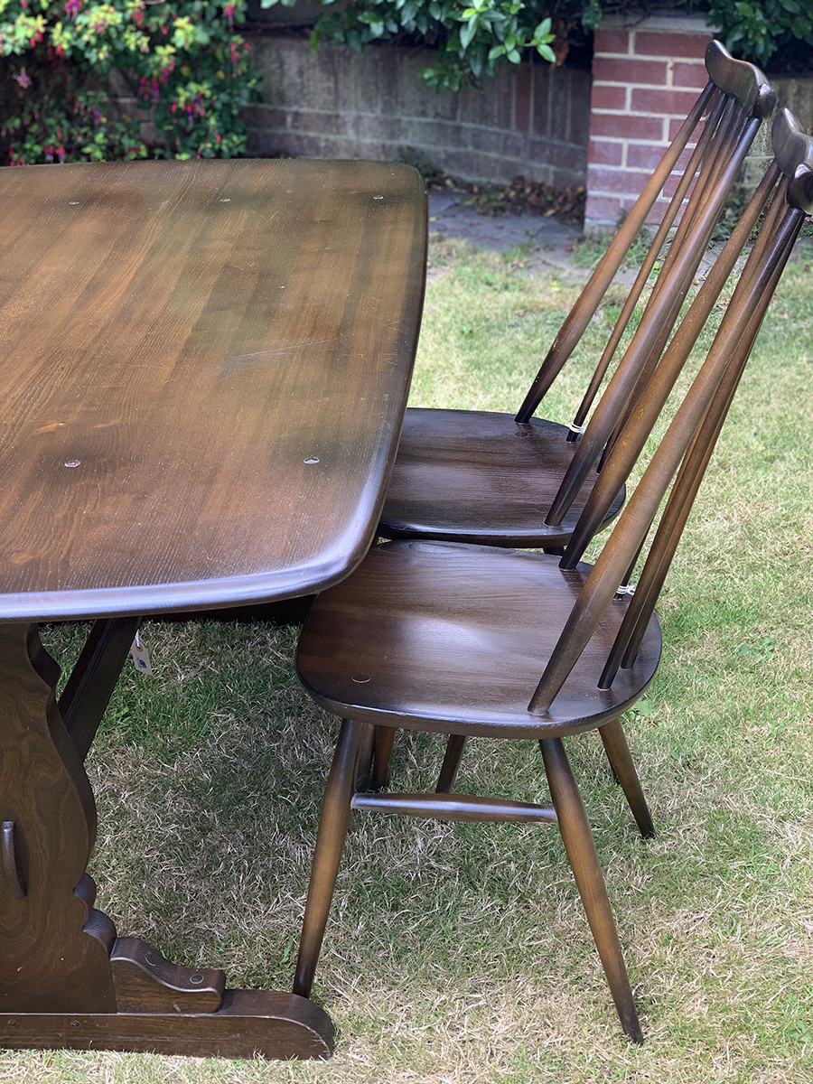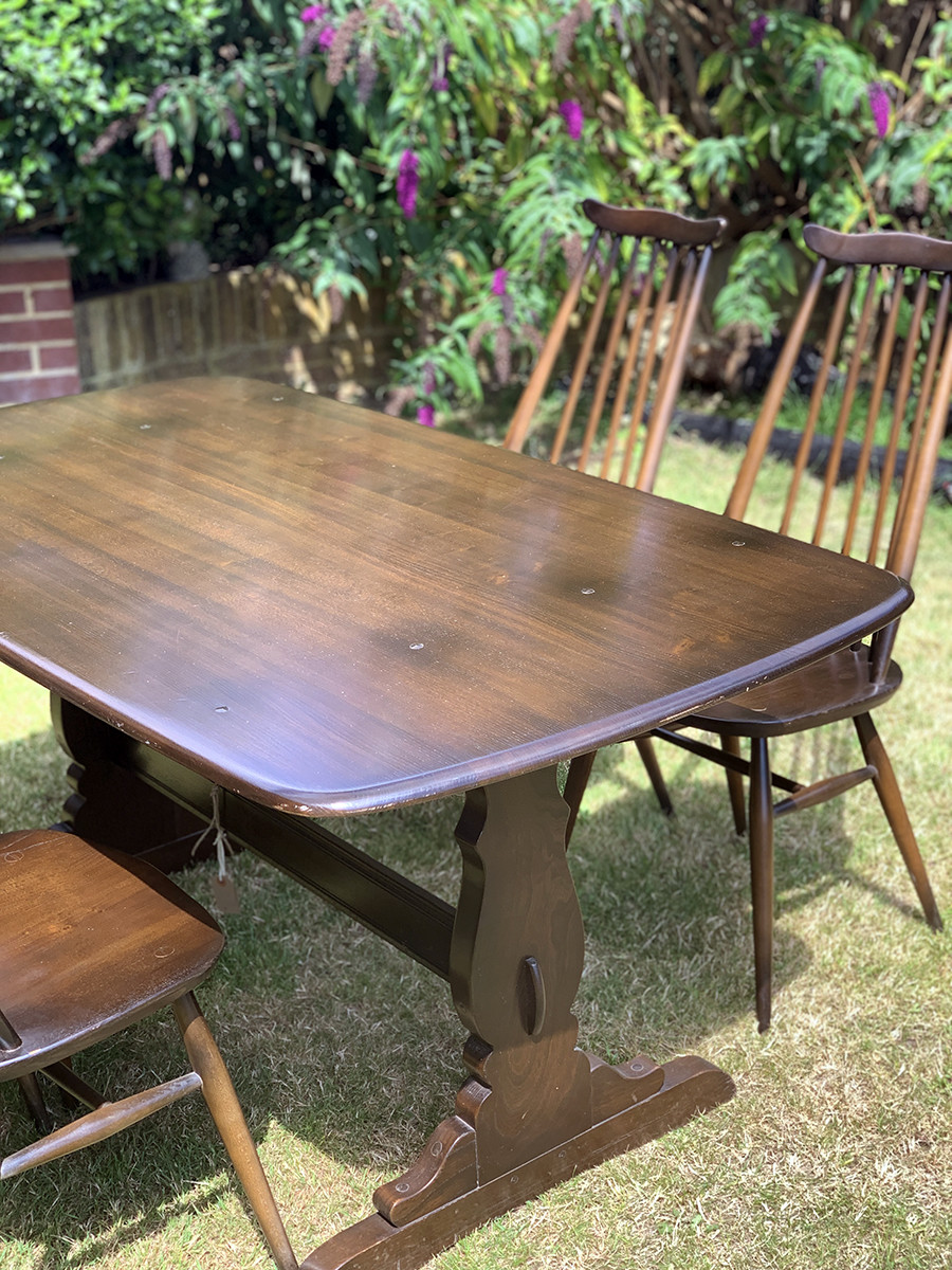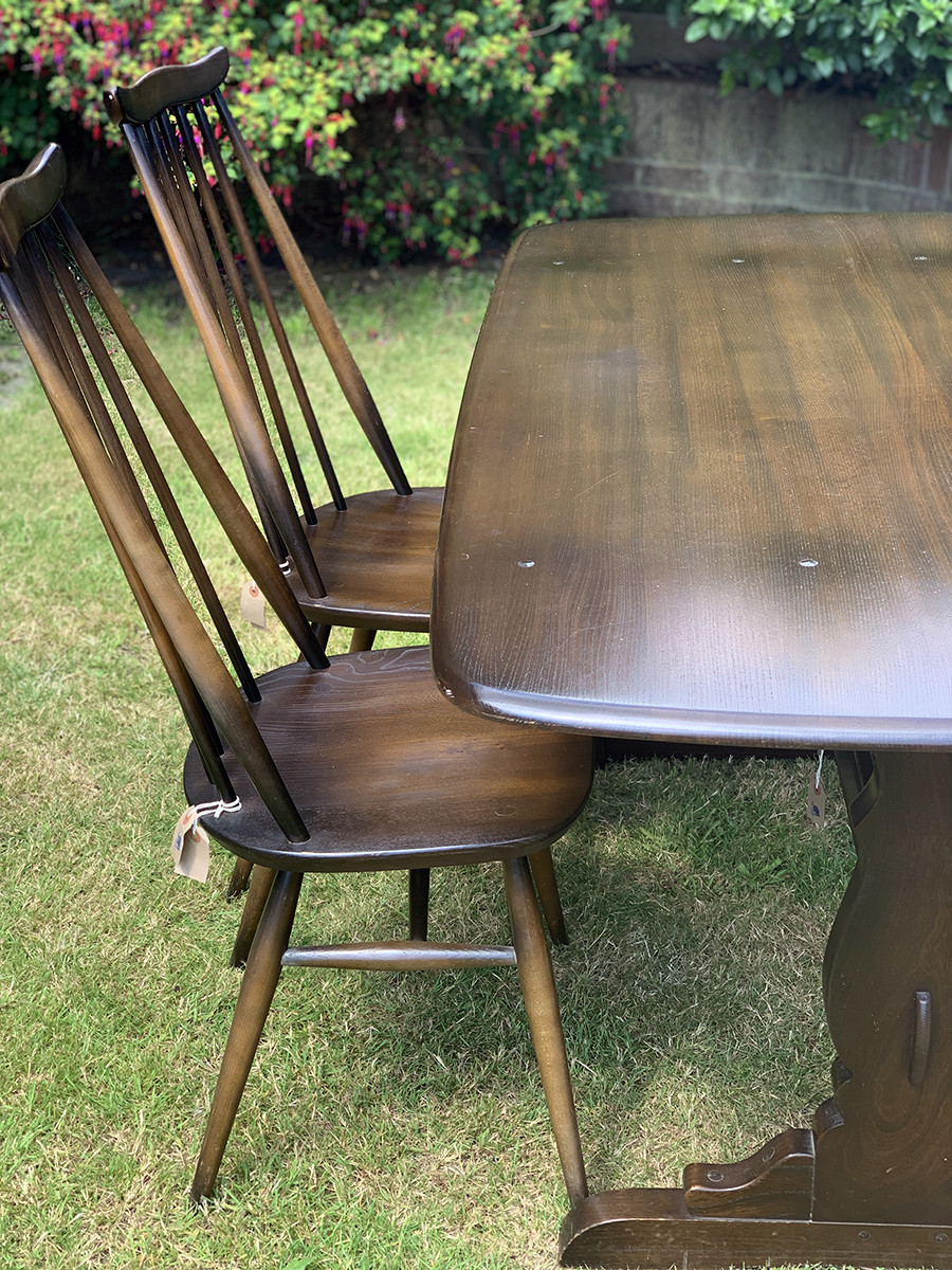 본 상품은 콜로니얼 레인지에 해당하는 상품입니다. 해당 테이블은 리펙토리 테이블이라는 종류로, 리펙토리 테이블은 테이블 양측의 다리를 잇는 구조의 테이블을 말하며 견고한 것이 특징입니다. 직사각형에 둥글게 엣지가 마무리 되어 있습니다. 오리지널 상품 상태 그대로 잘 보존 되어 있습니다.