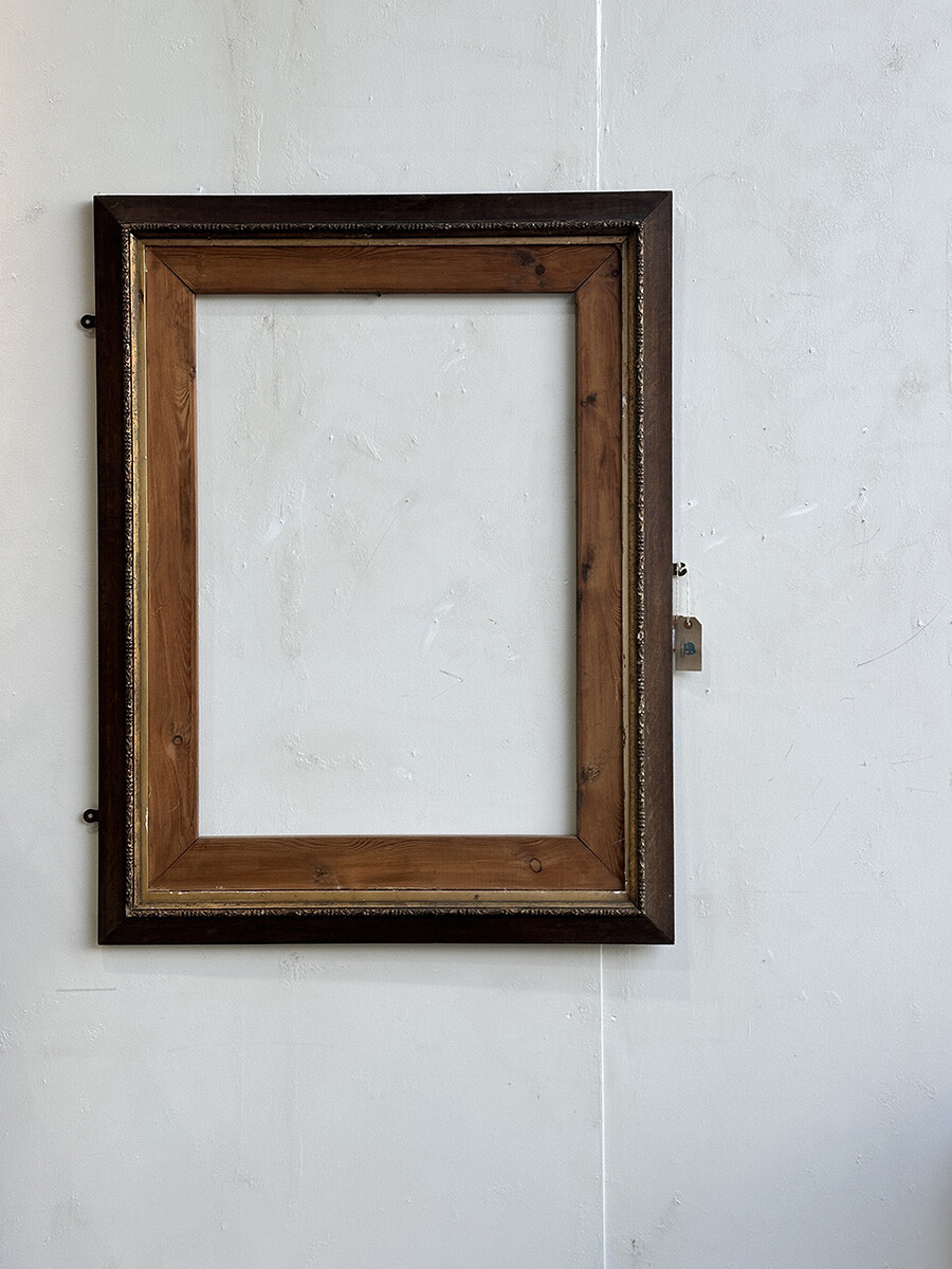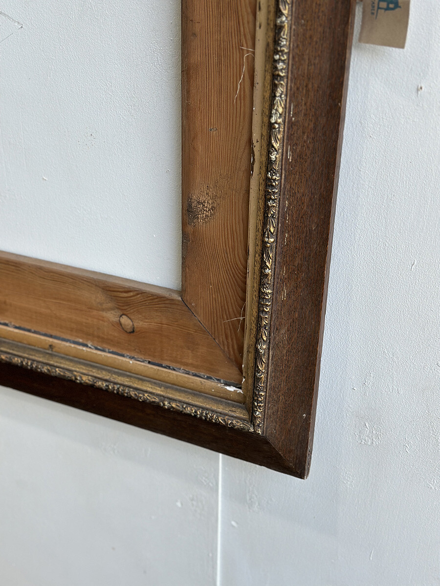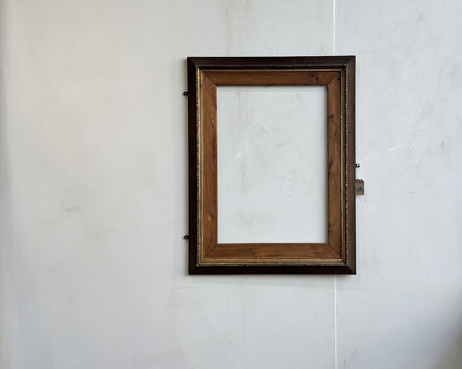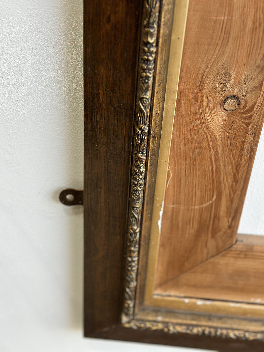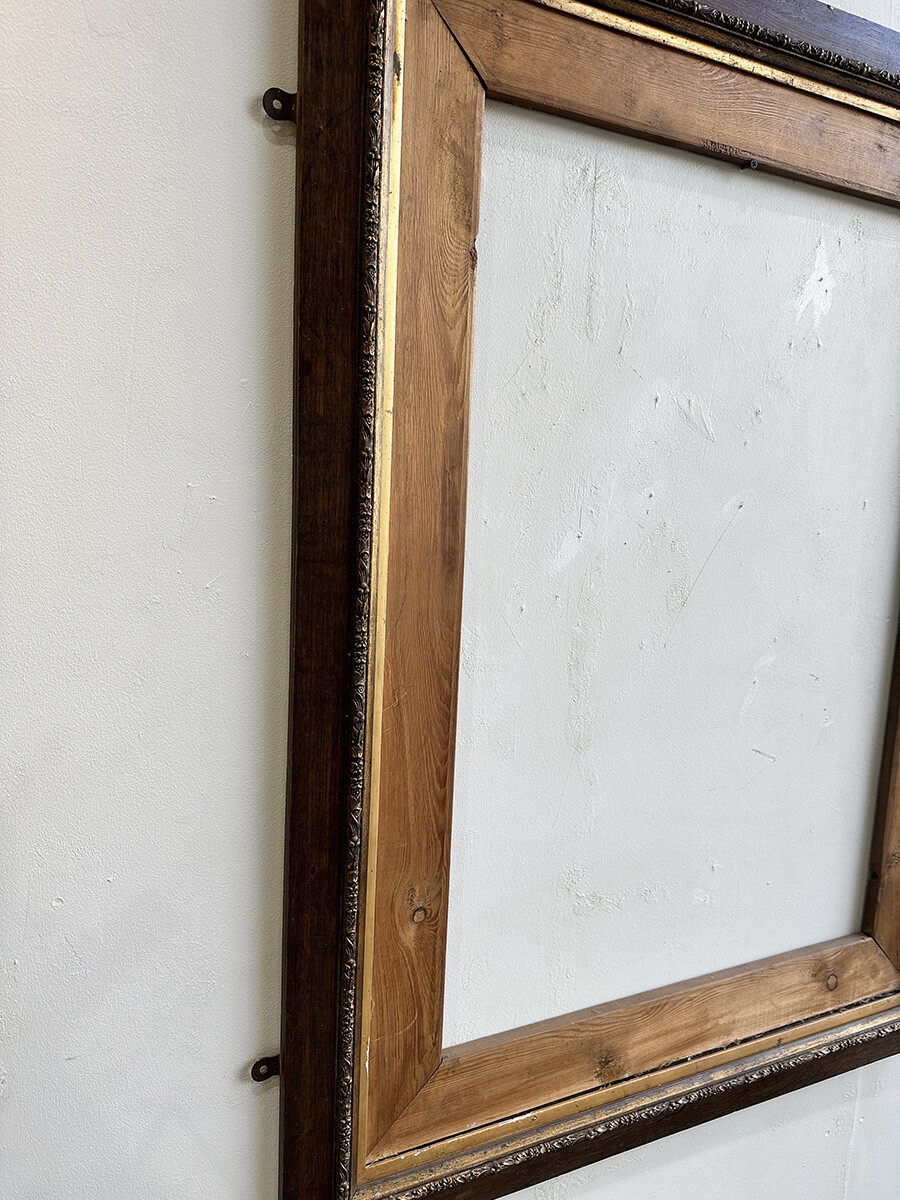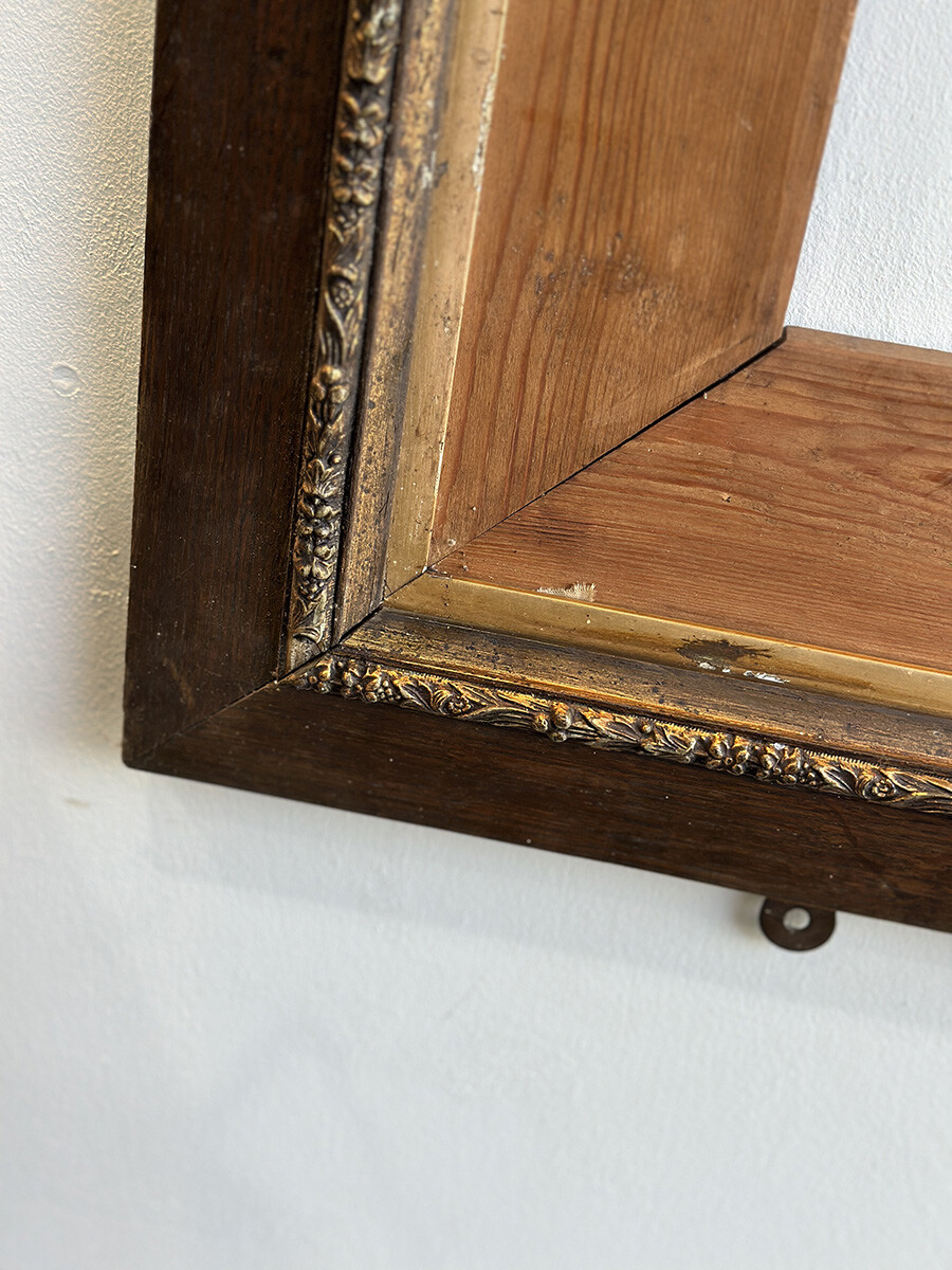 브라운 컬러의 원목 프레임에 얇은 길티드 프레임을 얹은 대형 사이즈의 앤틱 프레임입니다. 그림이나 사진, 혹은 거울을 표구하여 사용하시는 것을 추천합니다. 프레임 자체 유리는 남아 있지 않은 상태로 수집되었고, 벽에 고정할 때에 사용하는 브래킷은 오리지널 하드웨어 파츠로 남겨져 있습니다. 참고로 길티드 프레임(gilted frame)이란, 일반적으로 나무로 된 바탕 프레임 위에 플라스터(석고)로 패널과 장식 형태를 만들고, 그 위에 금박을 입히는 방식으로 제작한 것을 말합니다.