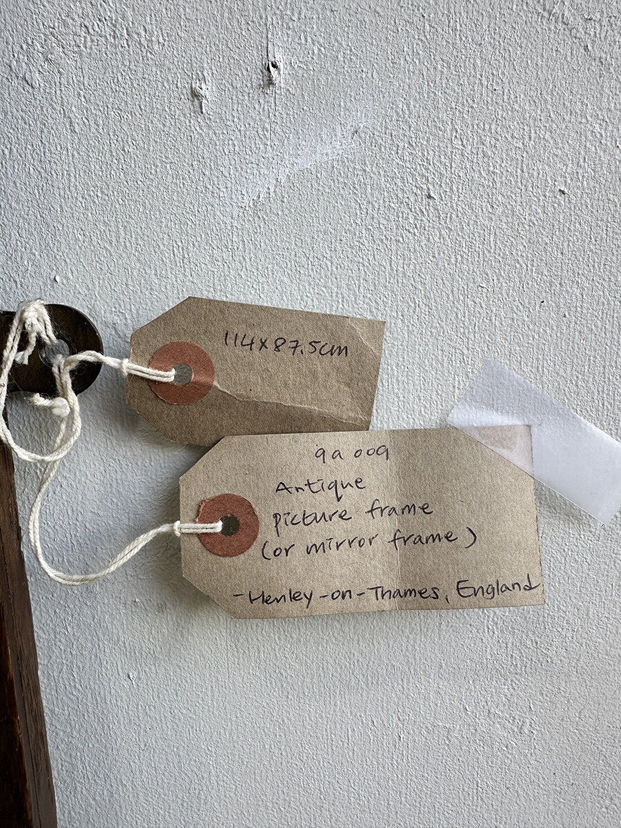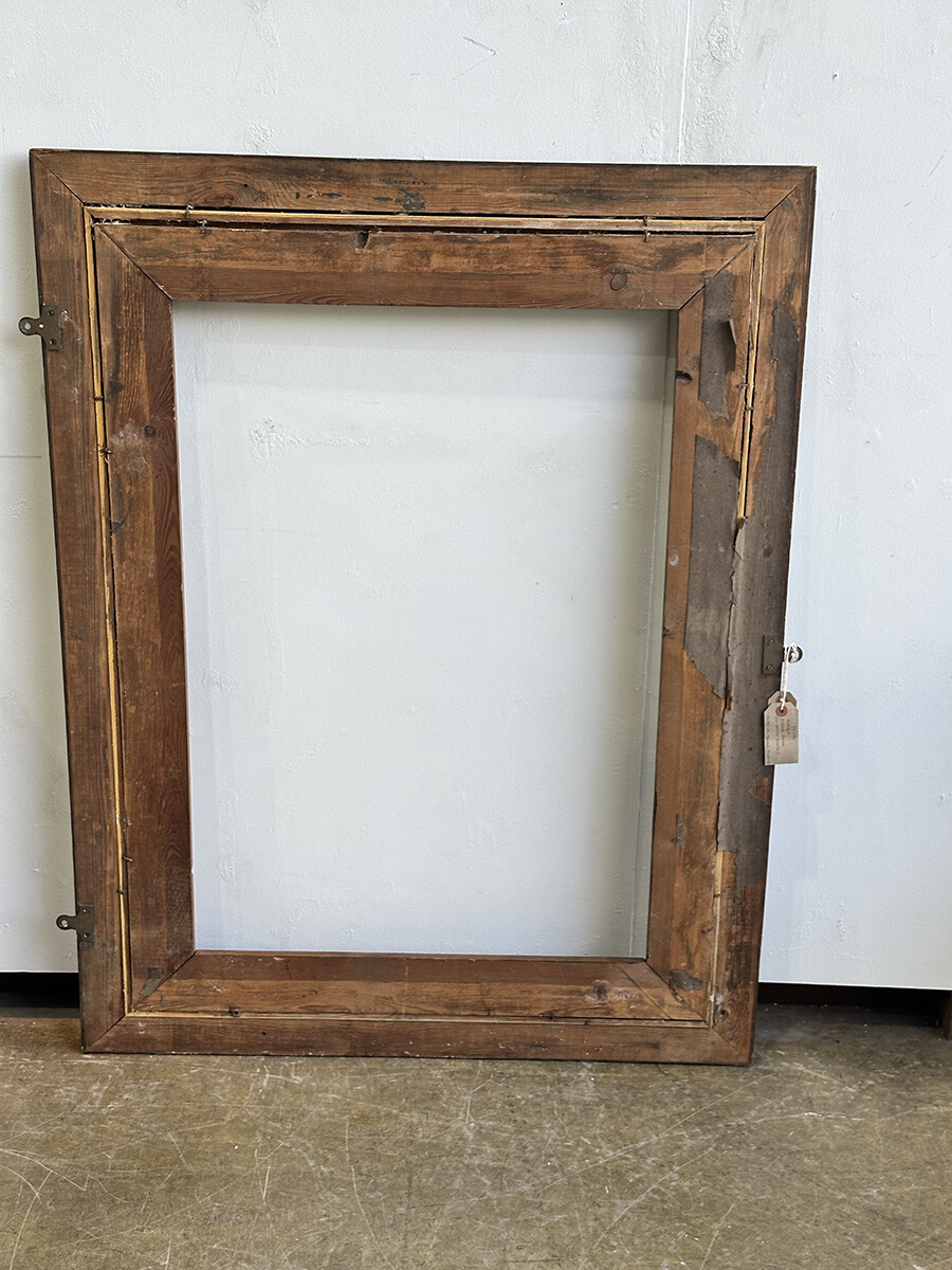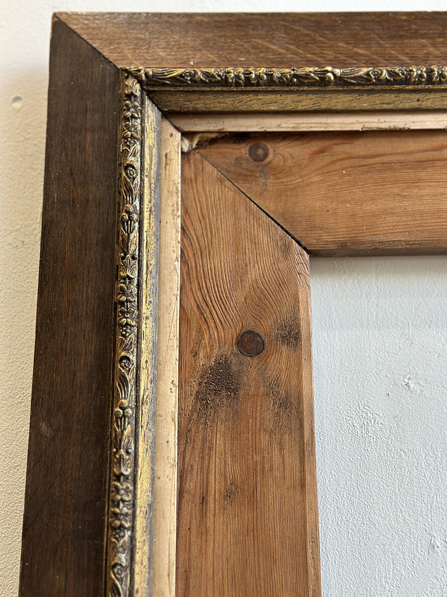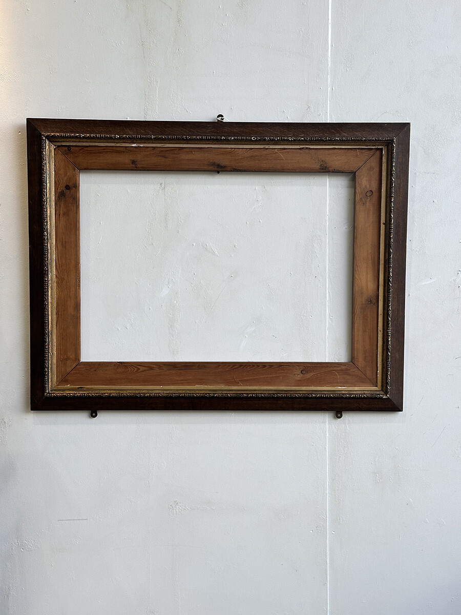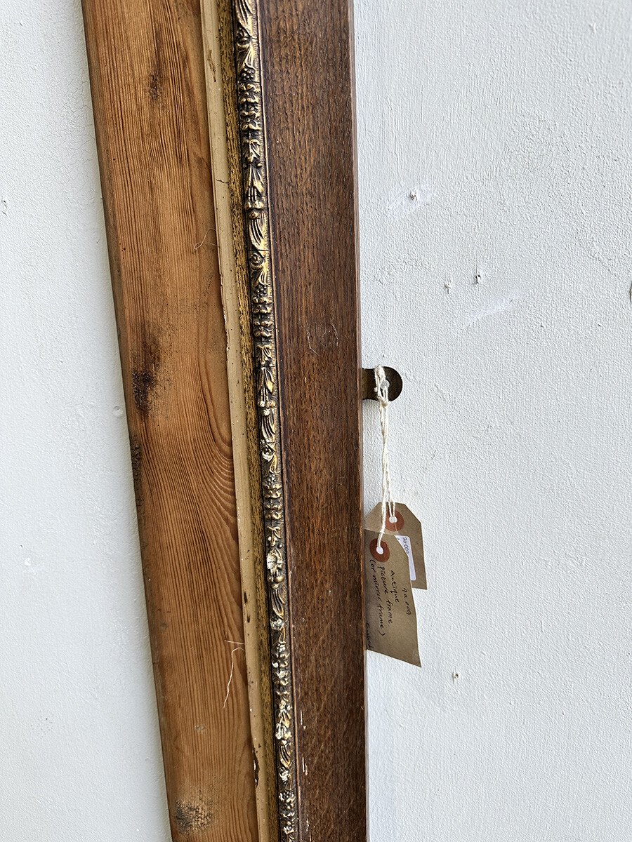 브라운 컬러의 원목 프레임에 얇은 길티드 프레임을 얹은 대형 사이즈의 앤틱 프레임입니다. 그림이나 사진, 혹은 거울을 표구하여 사용하시는 것을 추천합니다. 프레임 자체 유리는 남아 있지 않은 상태로 수집되었고, 벽에 고정할 때에 사용하는 브래킷은 오리지널 하드웨어 파츠로 남겨져 있습니다. 참고로 길티드 프레임(gilted frame)이란, 일반적으로 나무로 된 바탕 프레임 위에 플라스터(석고)로 패널과 장식 형태를 만들고, 그 위에 금박을 입히는 방식으로 제작한 것을 말합니다.