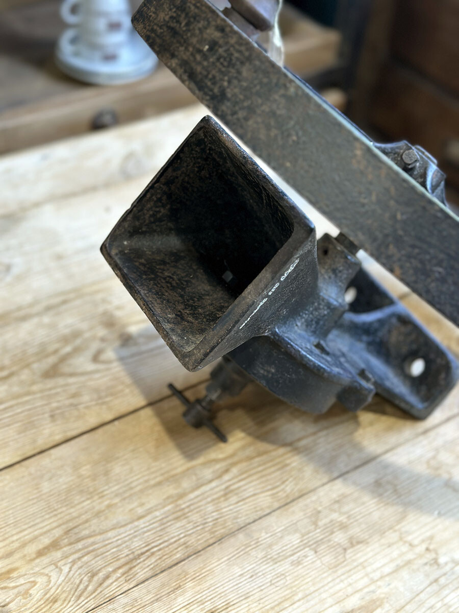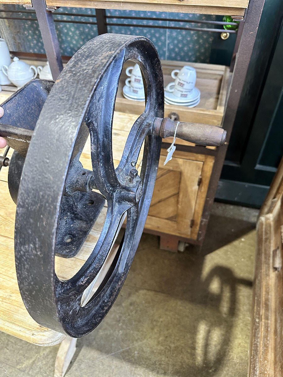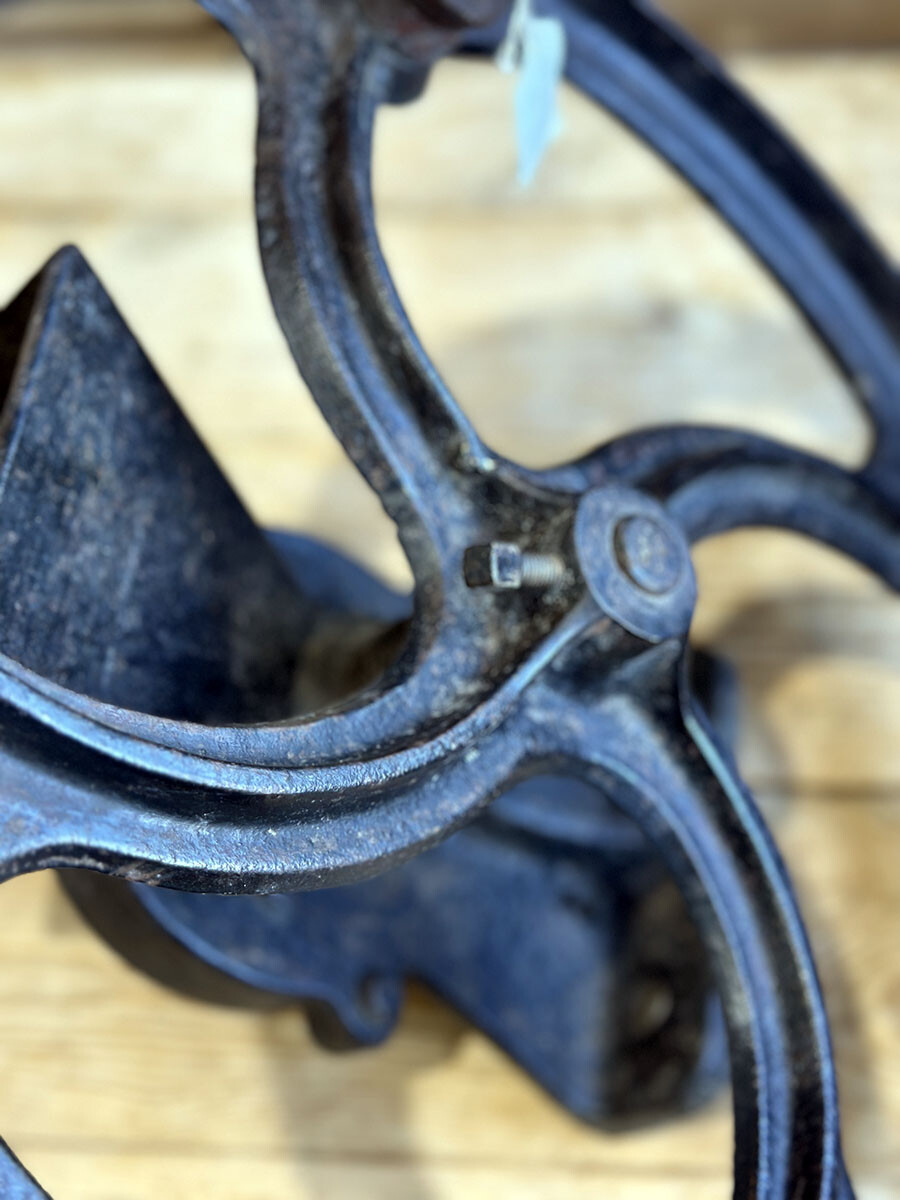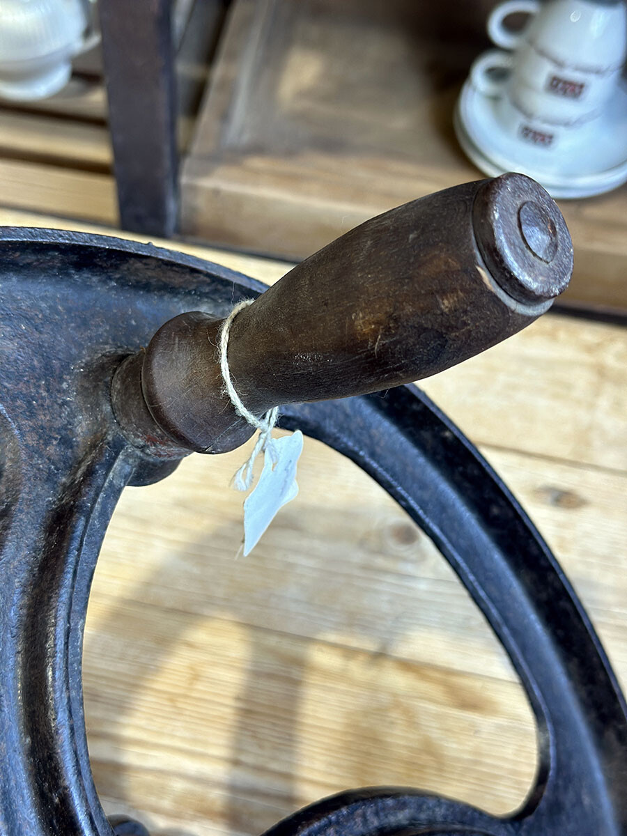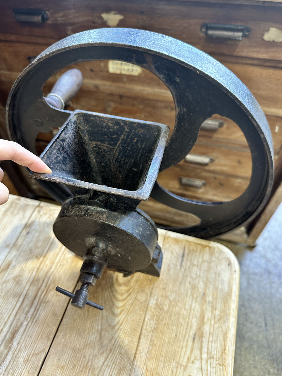 앤틱 카스트 아이언 커피 밀입니다. 카스트 아이언(무쇠 주물)으로 제작되어 무게가 매우 무겁습니다. 블랙 컬러의 카스트 아이언은 사진보다는 실물의 캐릭터가 훨씬 견고해 보이는 특징이 있습니다. 바이스처럼 작업대의 끝에 볼트와 너트로 고정하게끔 되어 있으며, 손잡이 부분은 우드 핸들이 달려 있습니다. 후면부에 잠금쇠를 조절해서 분쇄된 원두의 크기를 다르게 할 수 있는데, 실사용 용도 보다는 오나먼트나 소장용으로 추천 드립니다.