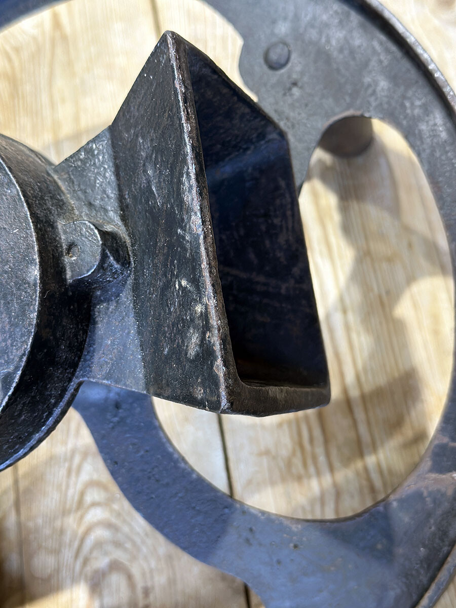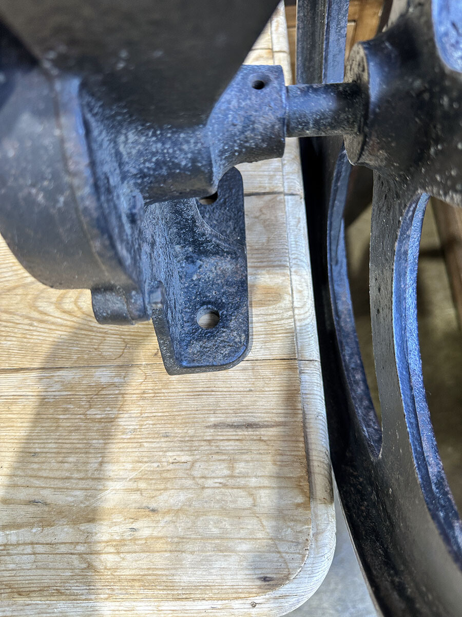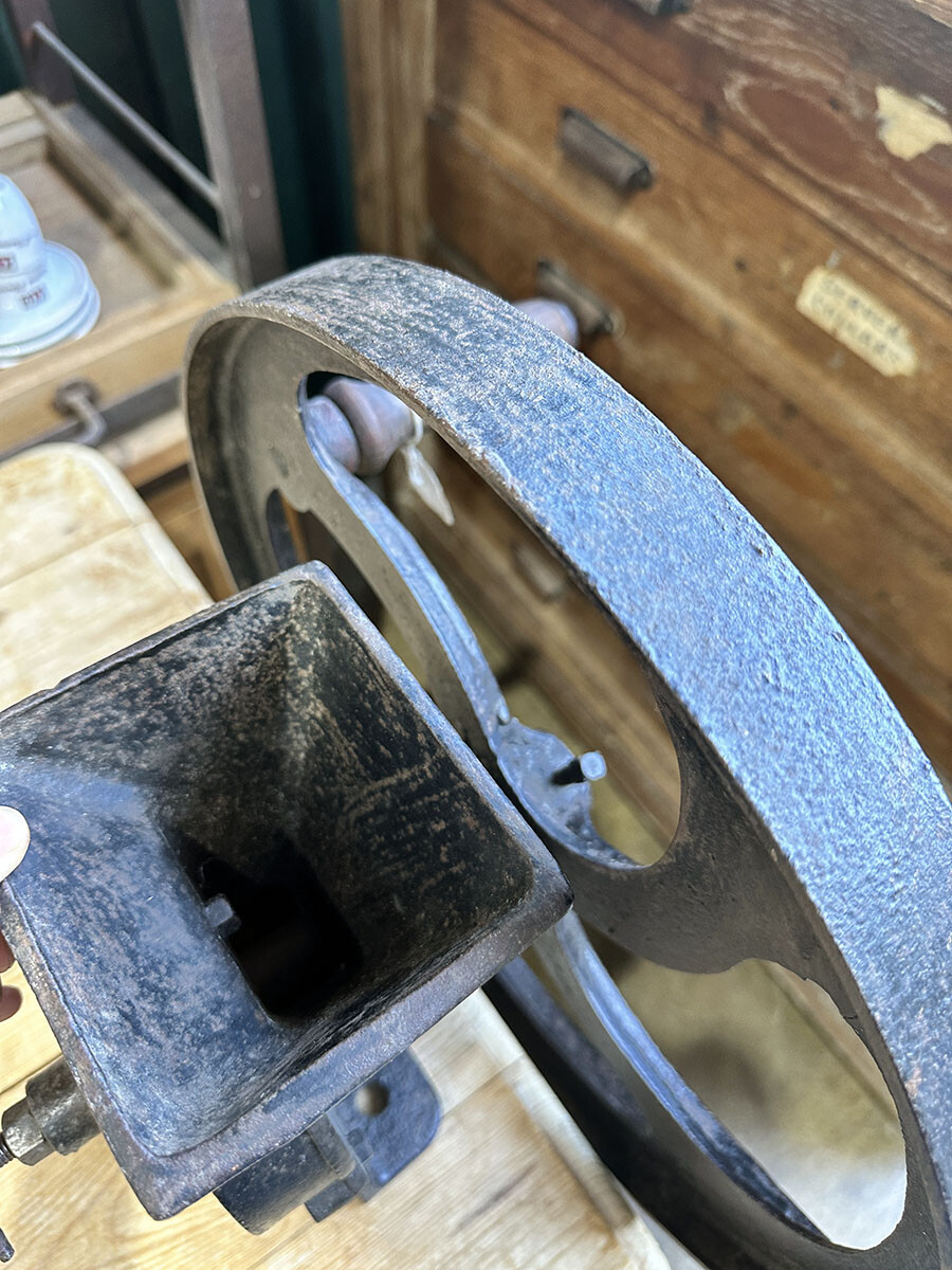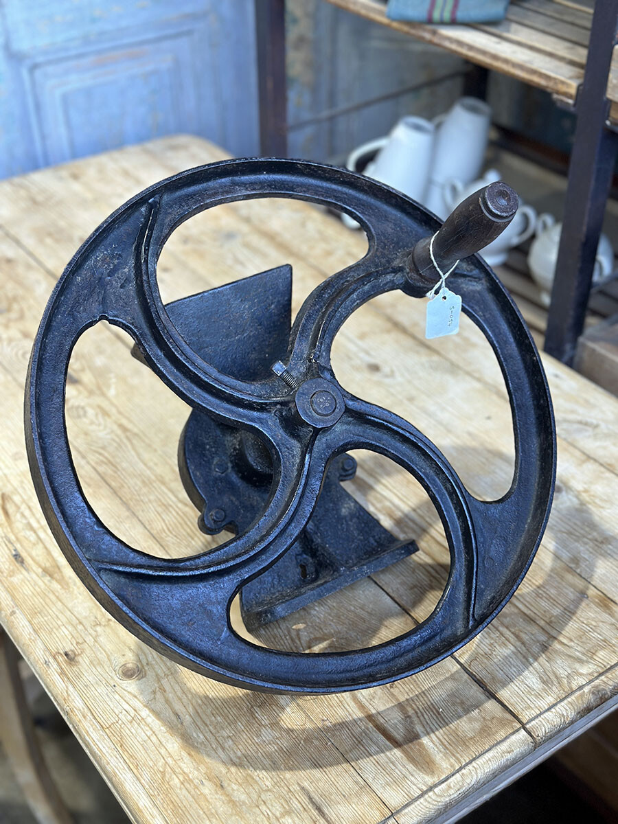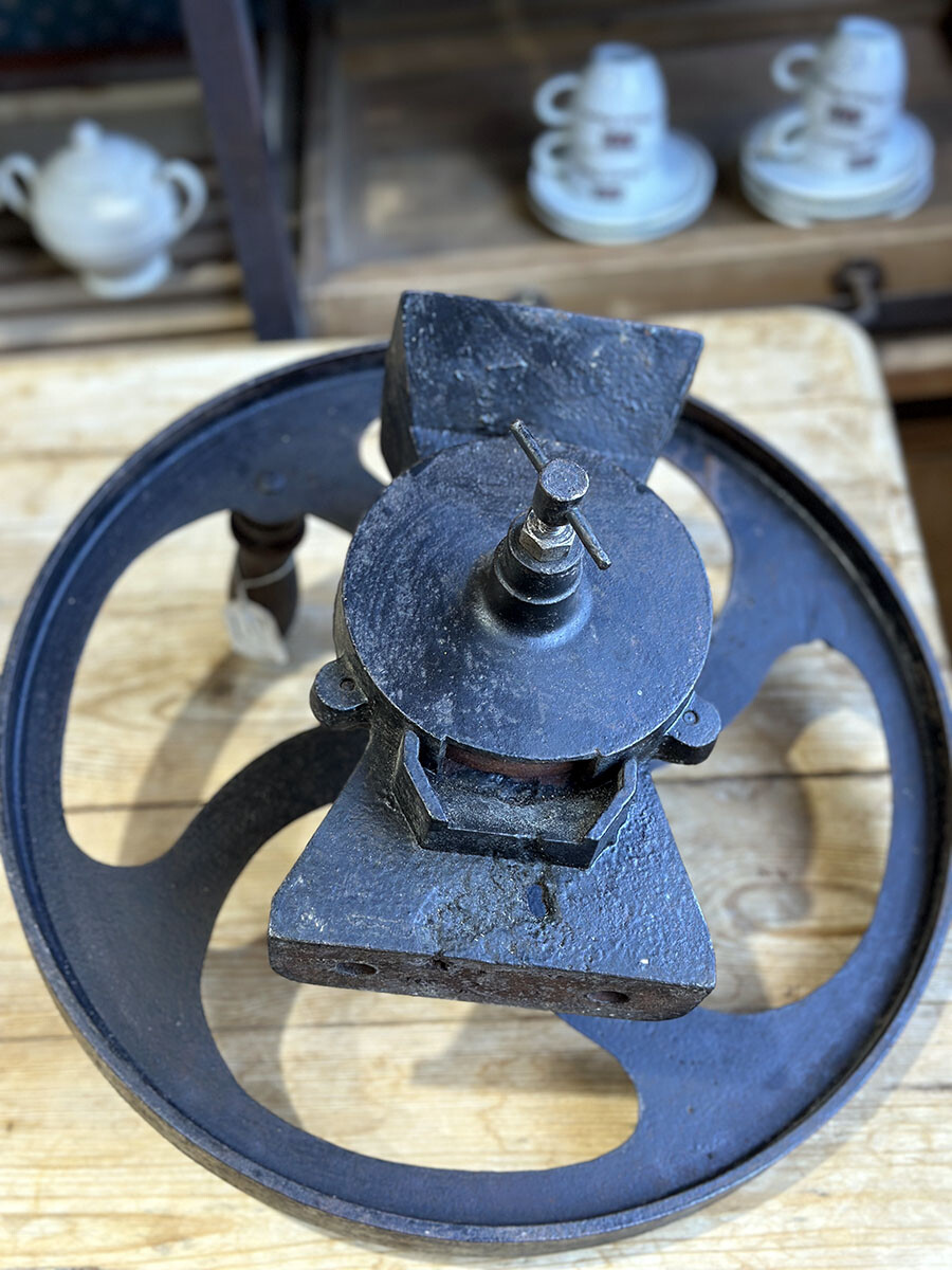 앤틱 카스트 아이언 커피 밀입니다. 카스트 아이언(무쇠 주물)으로 제작되어 무게가 매우 무겁습니다. 블랙 컬러의 카스트 아이언은 사진보다는 실물의 캐릭터가 훨씬 견고해 보이는 특징이 있습니다. 바이스처럼 작업대의 끝에 볼트와 너트로 고정하게끔 되어 있으며, 손잡이 부분은 우드 핸들이 달려 있습니다. 후면부에 잠금쇠를 조절해서 분쇄된 원두의 크기를 다르게 할 수 있는데, 실사용 용도 보다는 오나먼트나 소장용으로 추천 드립니다.