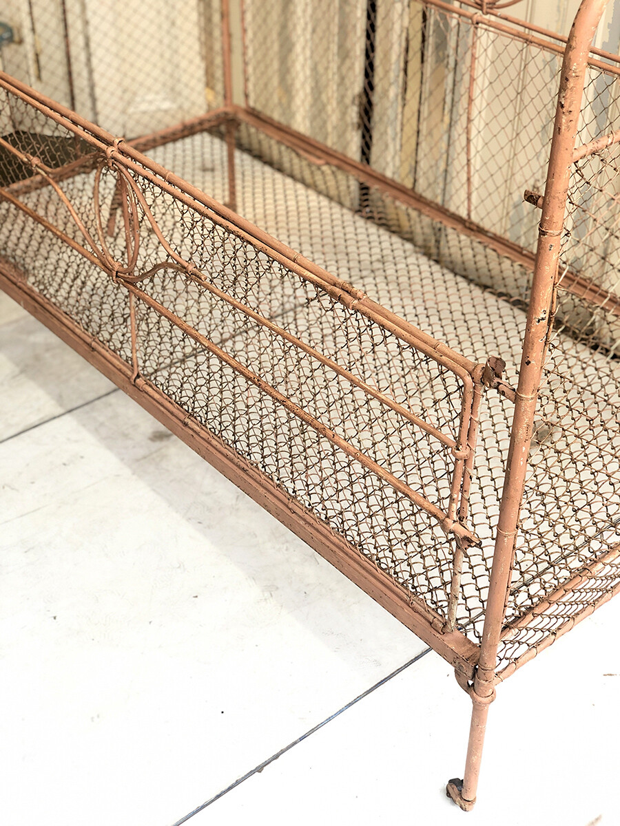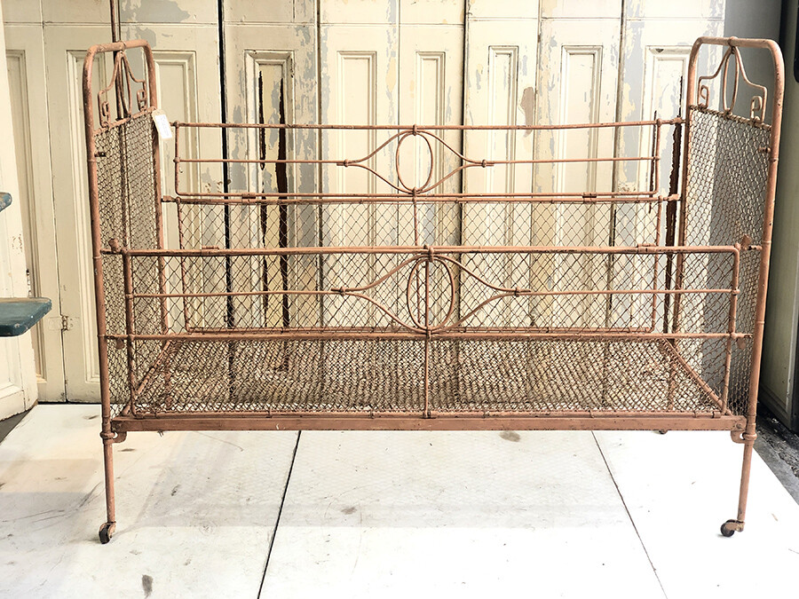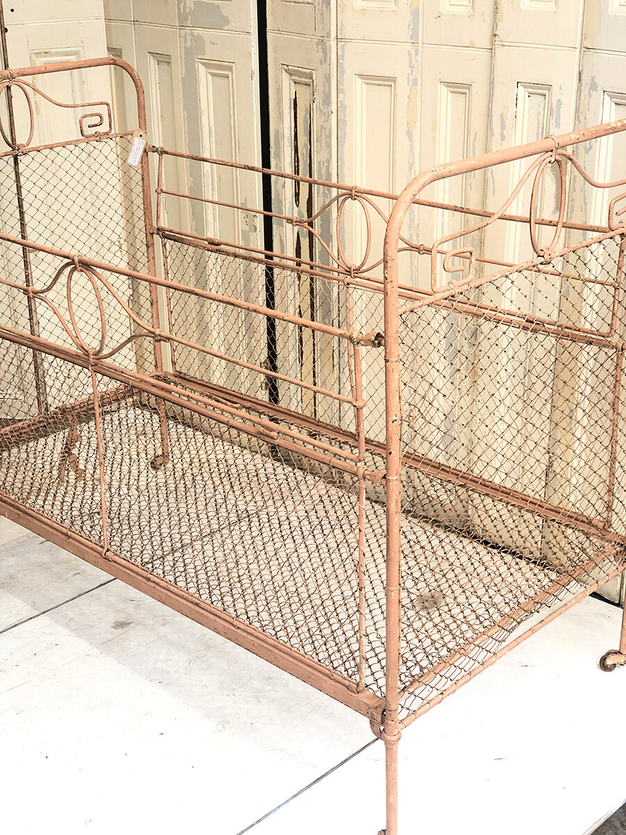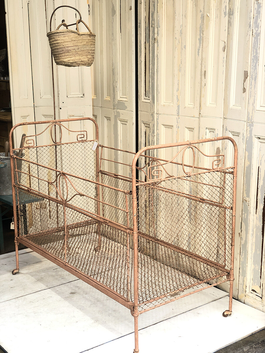 TS102 Antique French wrought iron & wire mesh baby cot with mobile hanger