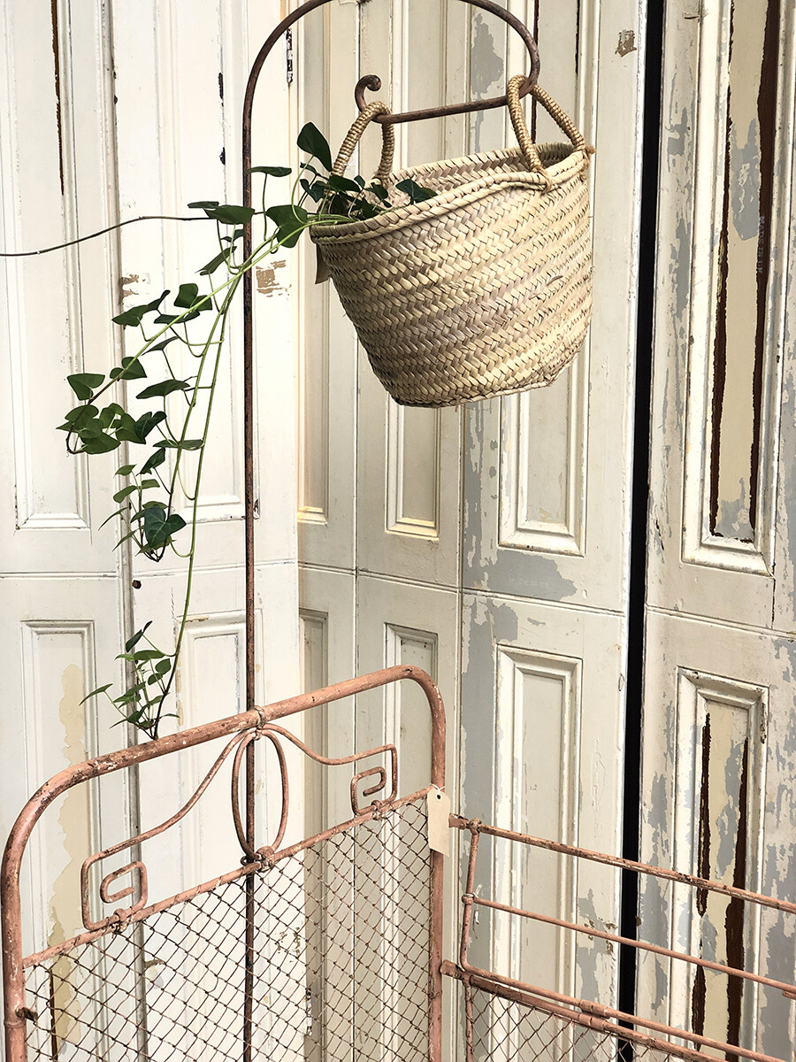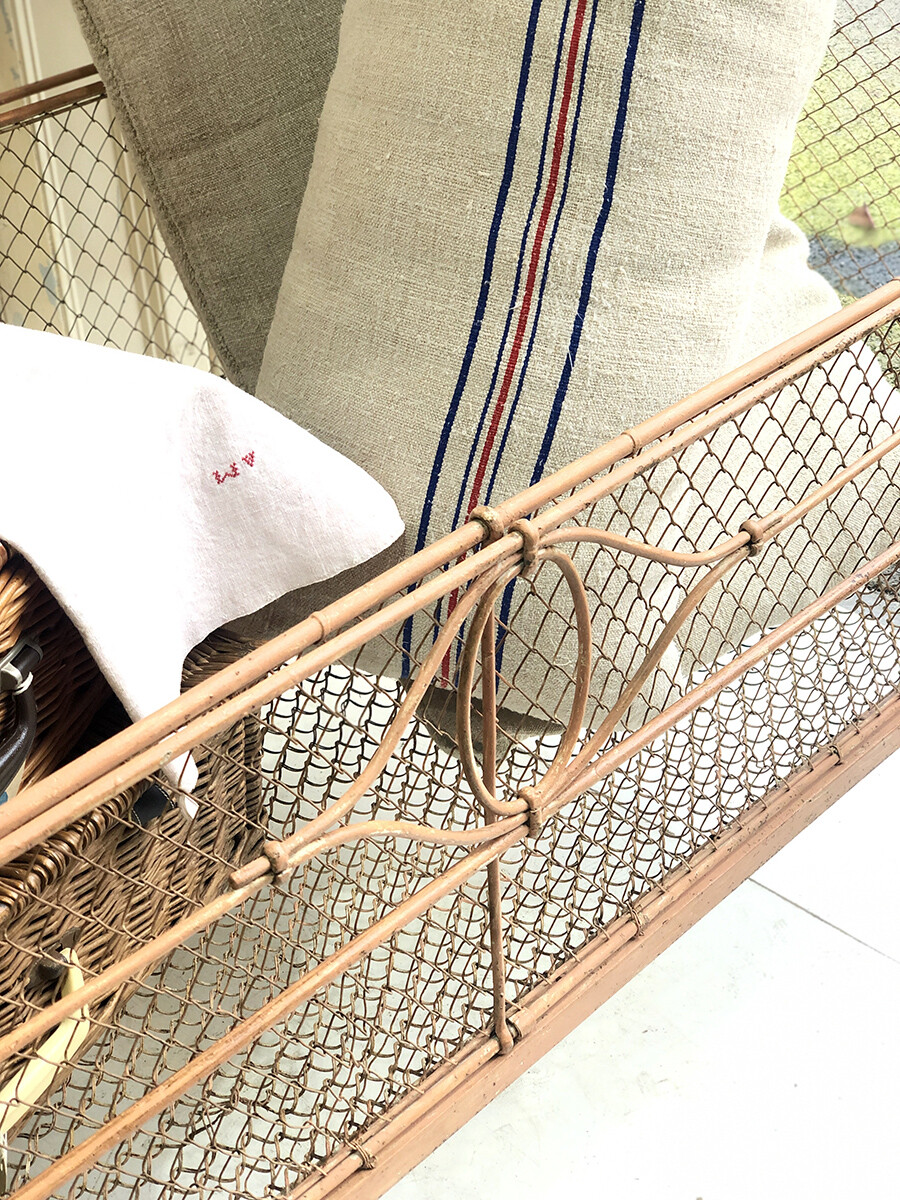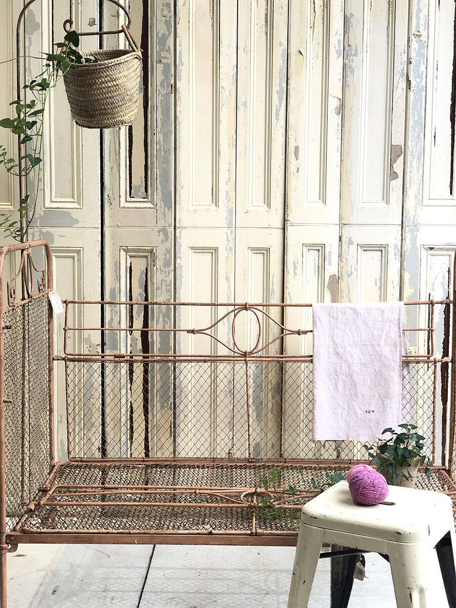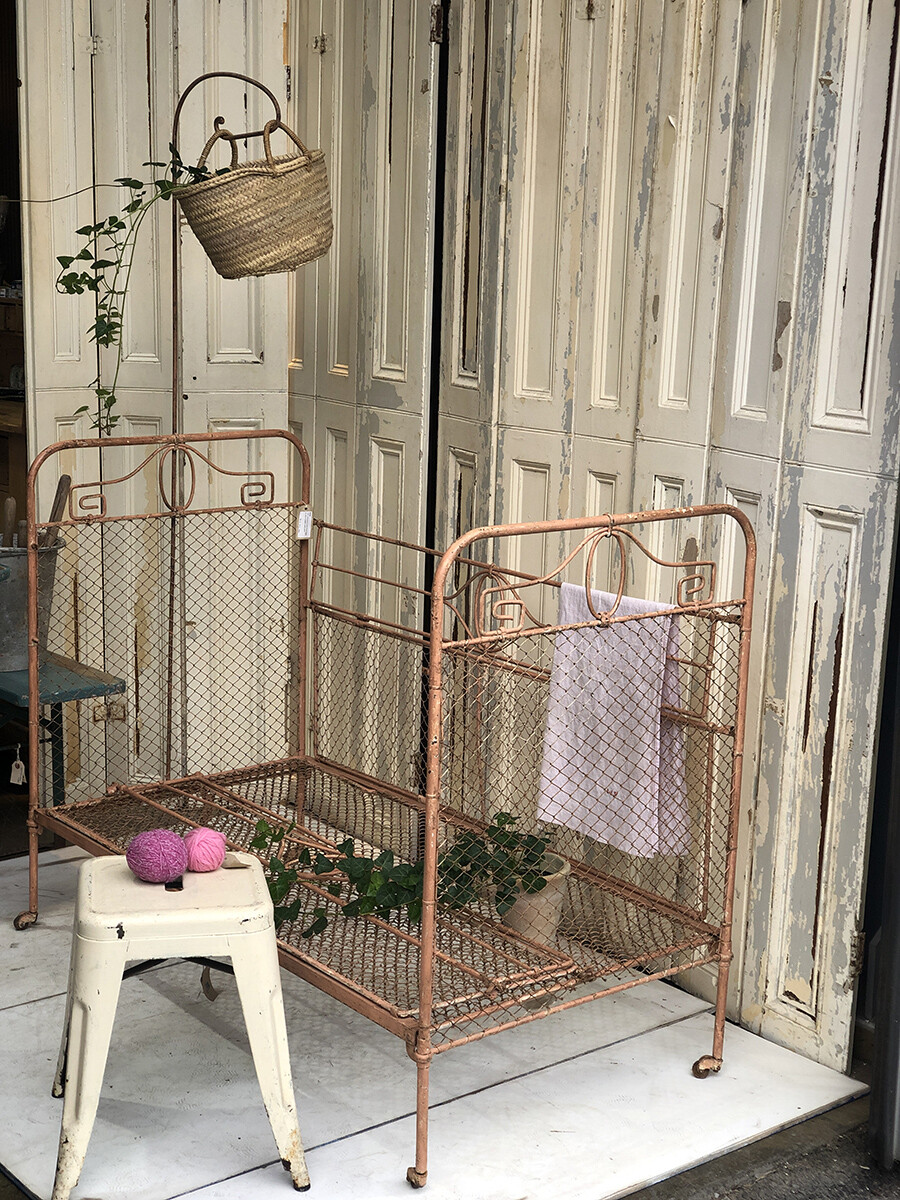 TS102 Antique French wrought iron & wire mesh baby cot with mobile hanger