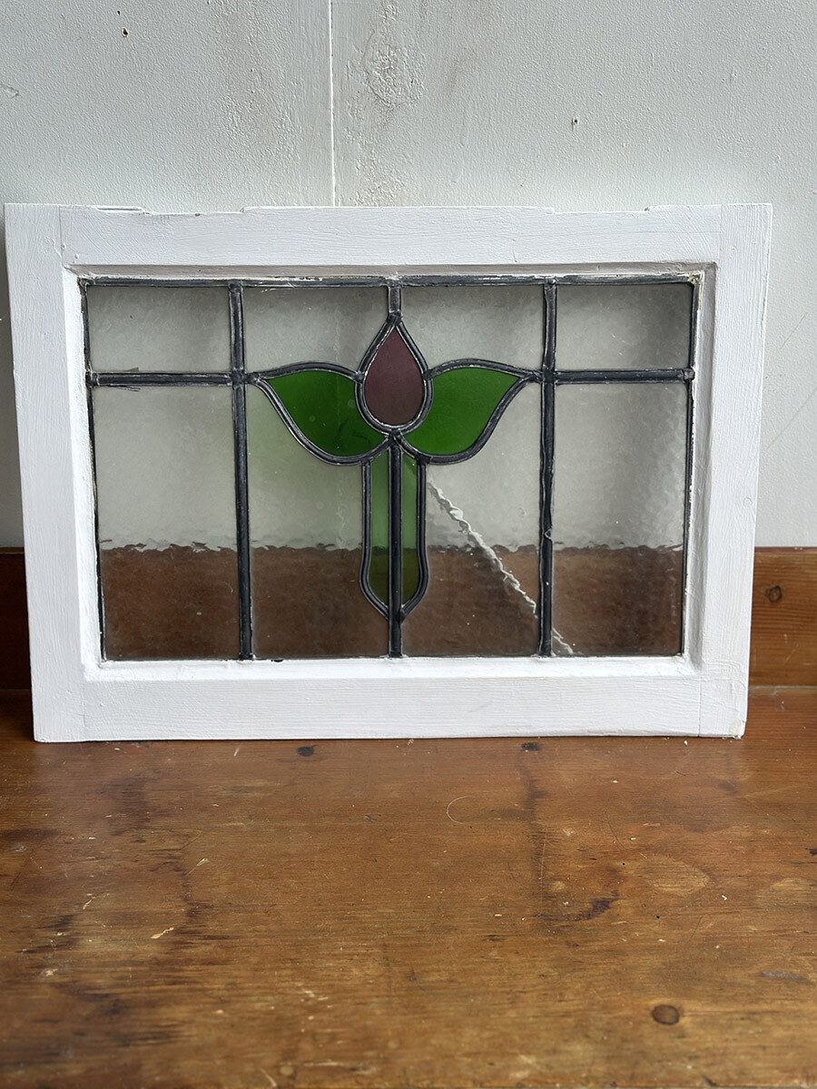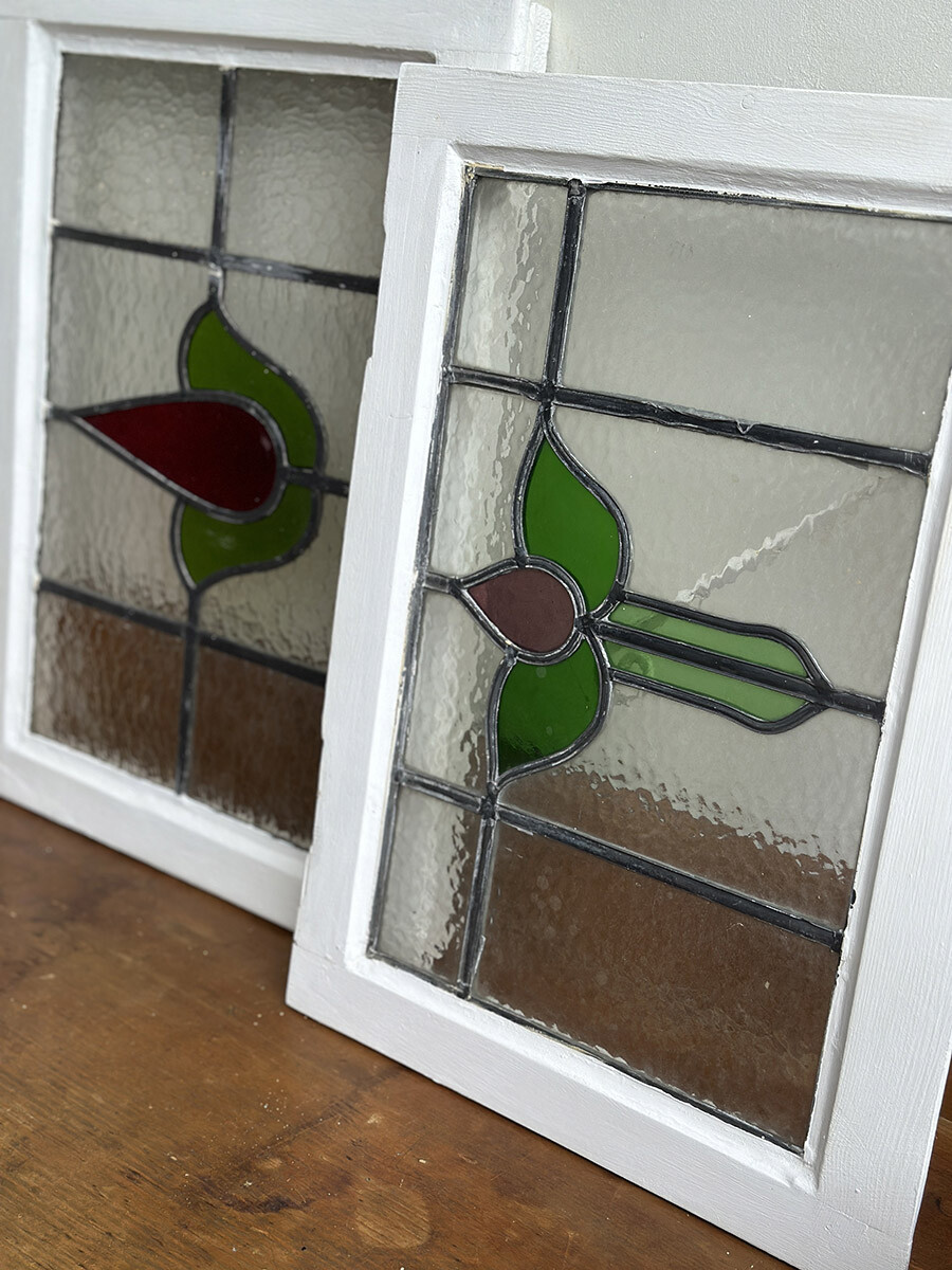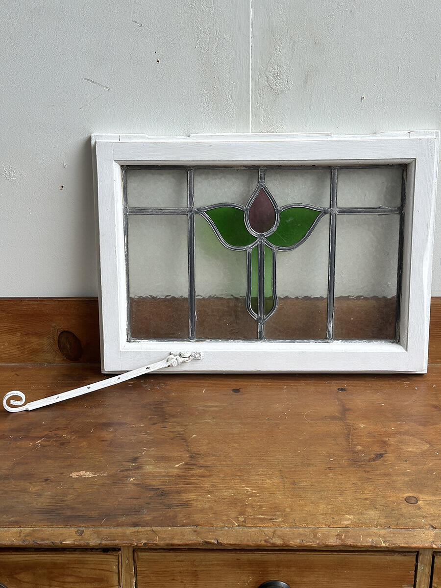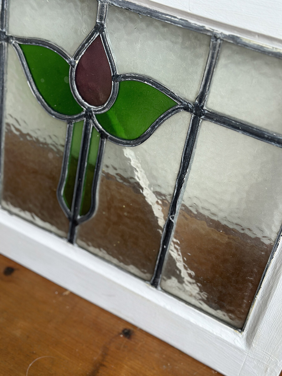 빈티지 스테인드 글래스입니다. 보통 영국의 주택 등에서 자주 사용되었던 스테인드 글래스 윈도우인데, 당시 주택 창문용으로 제작된 스테인드 글래스 문양은 대체로 다양한 꽃들을 모티프로 해서 패턴을 제작했습니다. 화이트 프레임은 원목으로 만들어져 있고, 내부에서 창을 여닫거나 고정시킬 때 사용했던 철제 손잡이가 남아 있습니다.