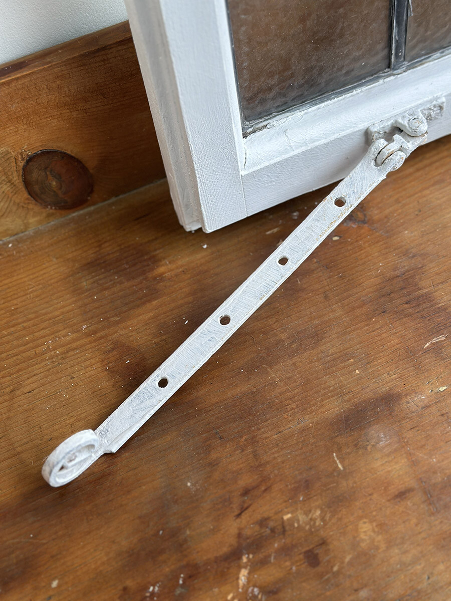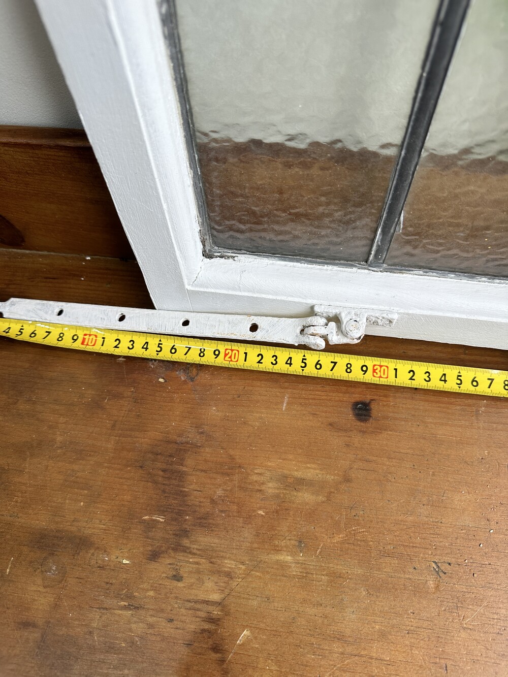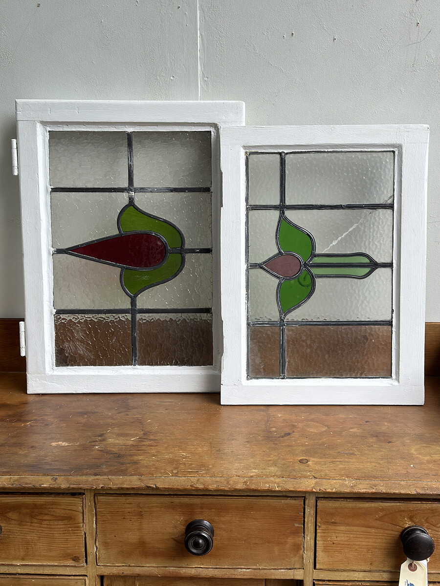 빈티지 스테인드 글래스입니다. 보통 영국의 주택 등에서 자주 사용되었던 스테인드 글래스 윈도우인데, 당시 주택 창문용으로 제작된 스테인드 글래스 문양은 대체로 다양한 꽃들을 모티프로 해서 패턴을 제작했습니다. 화이트 프레임은 원목으로 만들어져 있고, 내부에서 창을 여닫거나 고정시킬 때 사용했던 철제 손잡이가 남아 있습니다.